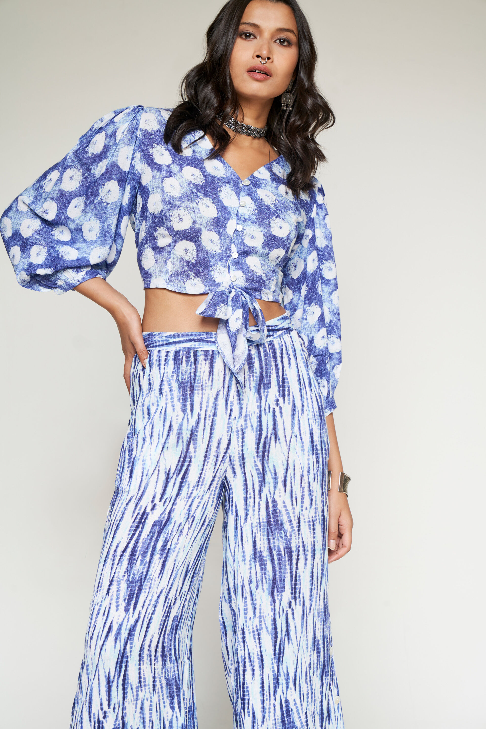 Got a vacation planned this summer close to a beach? We got a perfect match for you! Get this indigo blue tie-dye printed crop top and trouser set. The coordinates flaunt a super cute oversized bow tie-up crop top with three-fourth sleeves and wide-leg bottoms. Elevate this fashionable look with a cane hat, oversized bag and beach slippers to soak up all the sun in style.