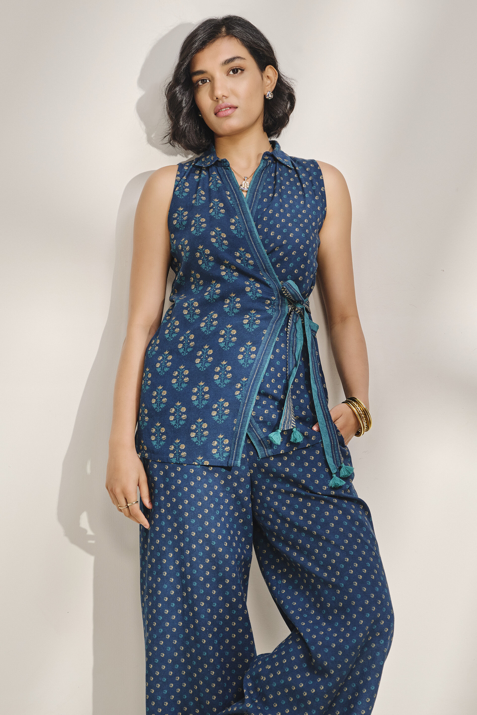 Fun, flirty, and super comfy — this set pairs a printed wrap top with straight pants in a soft cotton-viscose-linen blend. Breezy, flattering, and perfect for day dates or art fairs.