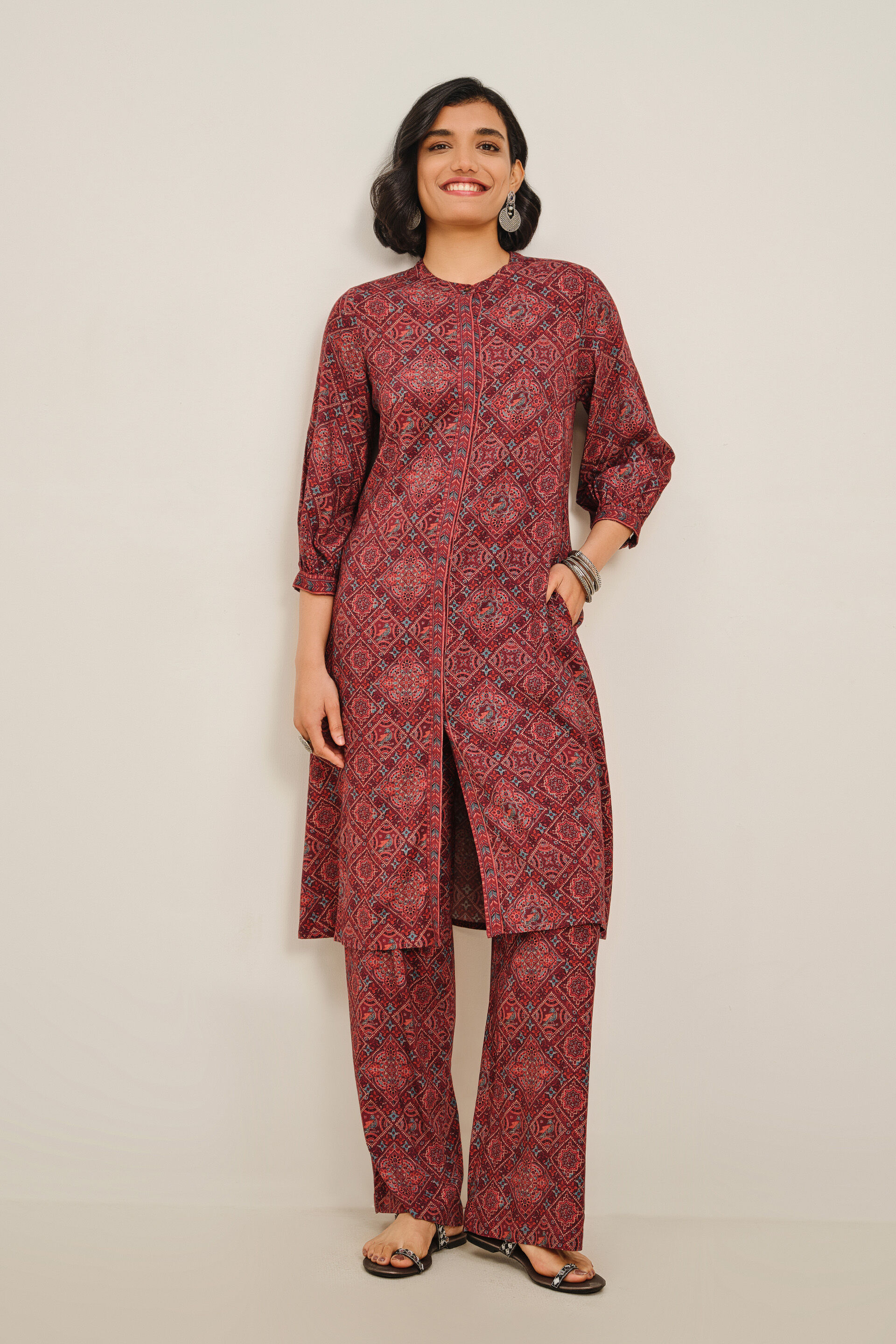Stay stylish and easy in the Jamun Breeze Set. Crafted in a rich burgundy hue, the printed kurta features a flattering V-neck, playful bell sleeves, and a soft A-line cut. Paired with comfy dhoti pants, it’s perfect for brunches, shopping sprees, or relaxed evenings with friends.