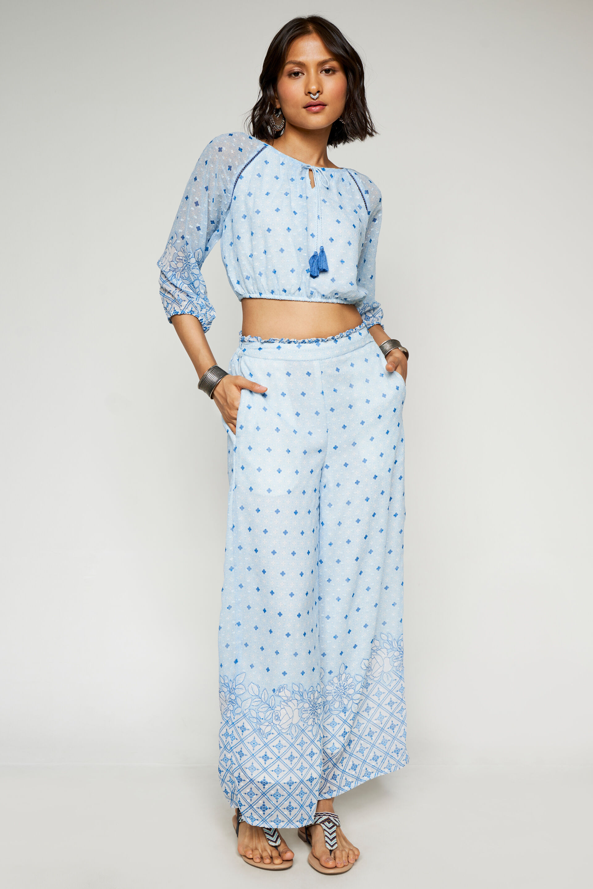 Make your road trip a fashionable statement with this two-piece set for women from Global Desi. This blue set is crafted from the softest georgette fabric, this intricate floral printed set comprises a crop top with a round neck, three-fourth sleeves with a wide-leg bottom featuring an elasticated waistband and two pockets. Stylise this classy two-piece with oxidised silver earrings and complementing footwear.