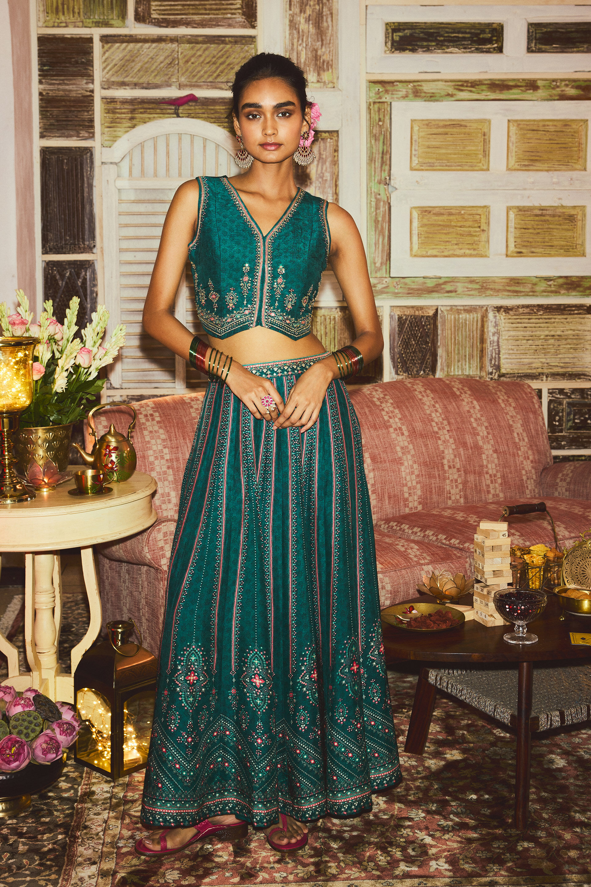 A two-piece set in a green hue that comes with a sleeveless printed waistcoat featuring a V-neck and A-line silhouette, paired with a panelled skirt in a calf-length finish, secured with a zip-button closure for festive occasions.