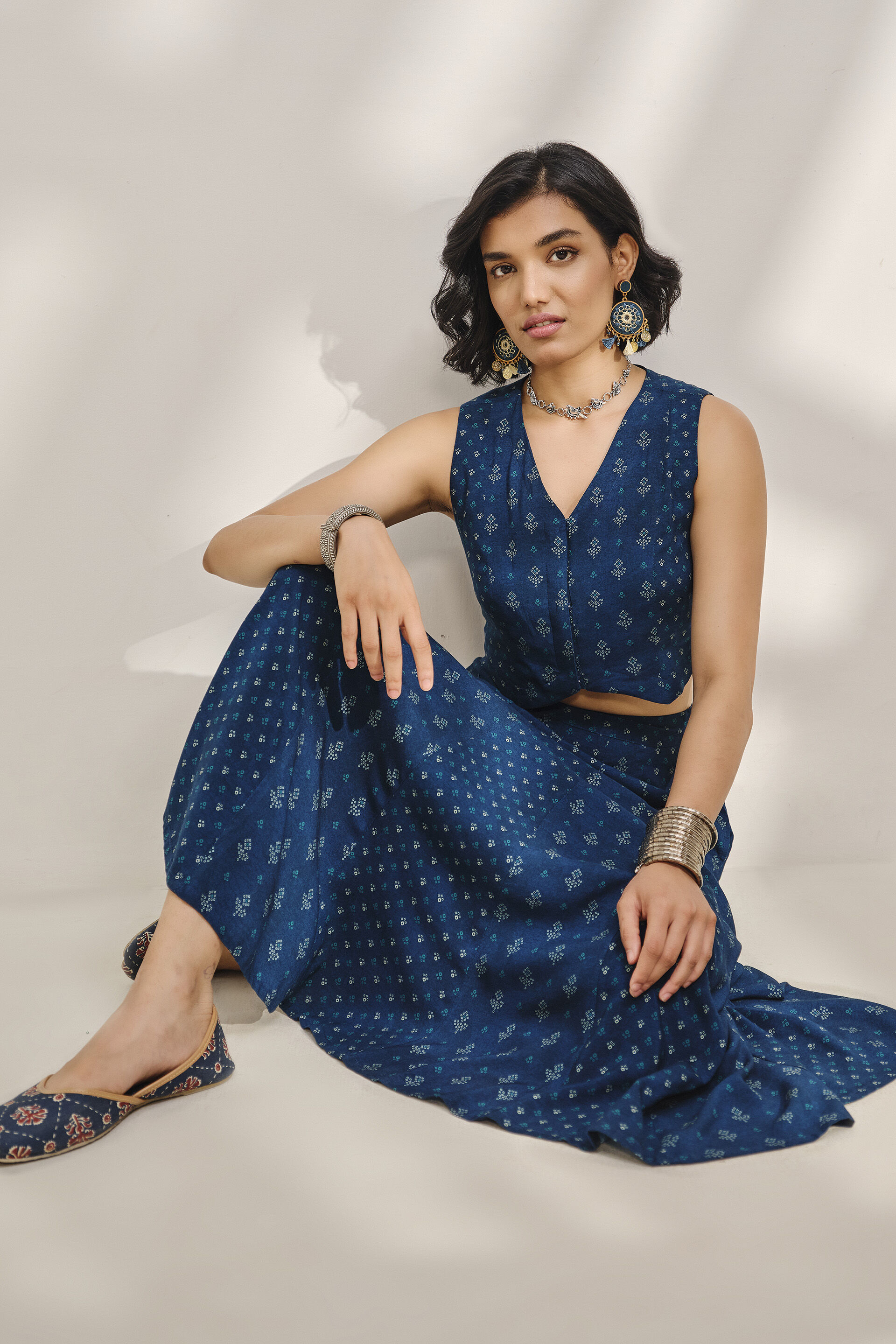 Go twirl mode on with this set, an easy - breezy pairing of a sleeveless printed V-neck waistcoat-style top and a printed panelled skirt. Made in viscose, it moves with you and your mood - perfect for brunches, beach strolls, or just dancing through the day.