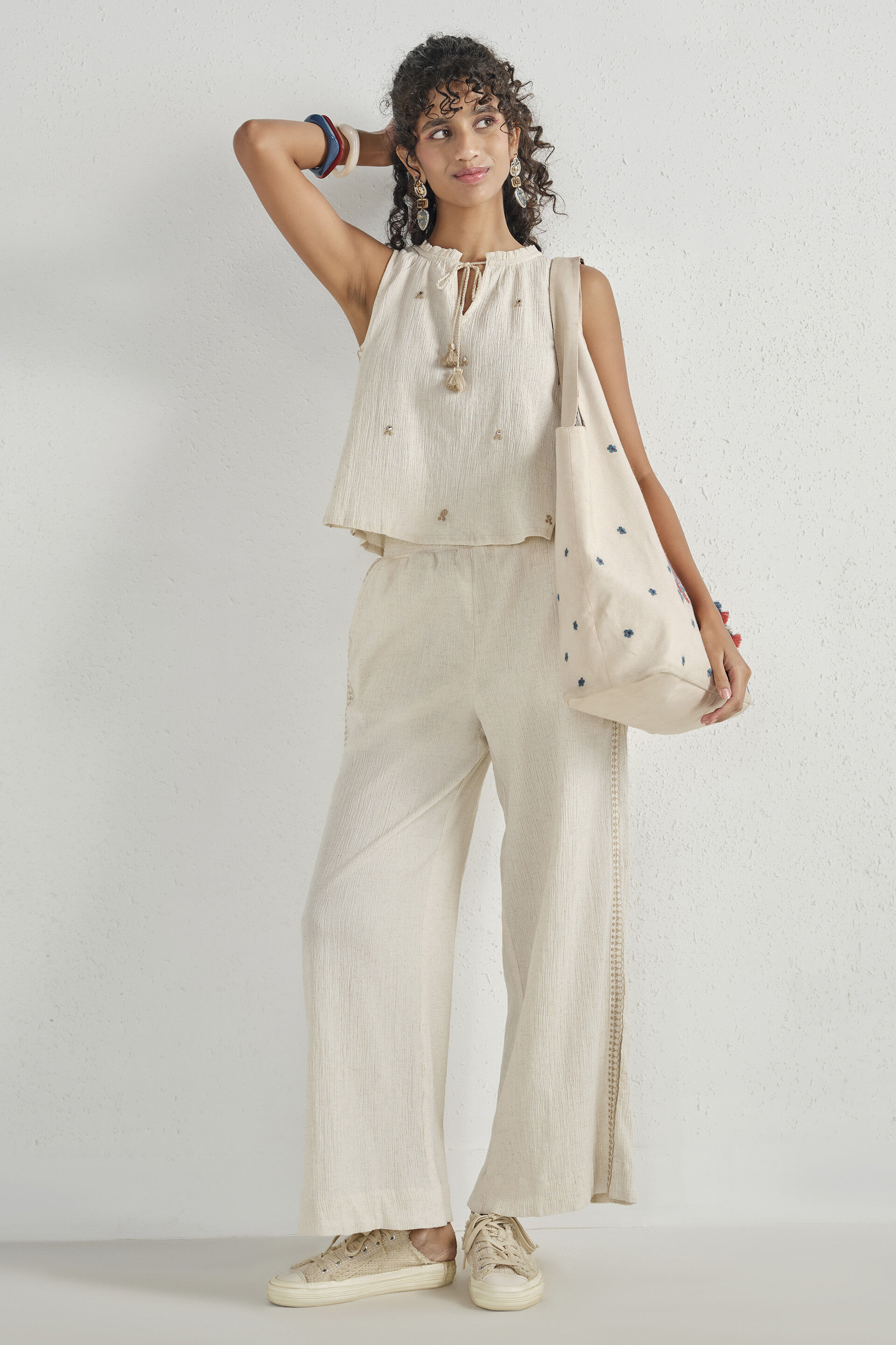 A two-piece natural tone set featuring an A-line crop top with in-cut sleeveless shoulders and a round neckline with front tie-up, paired with wide-leg pants with two pockets. Designed in a cotton blend for everyday comfort.