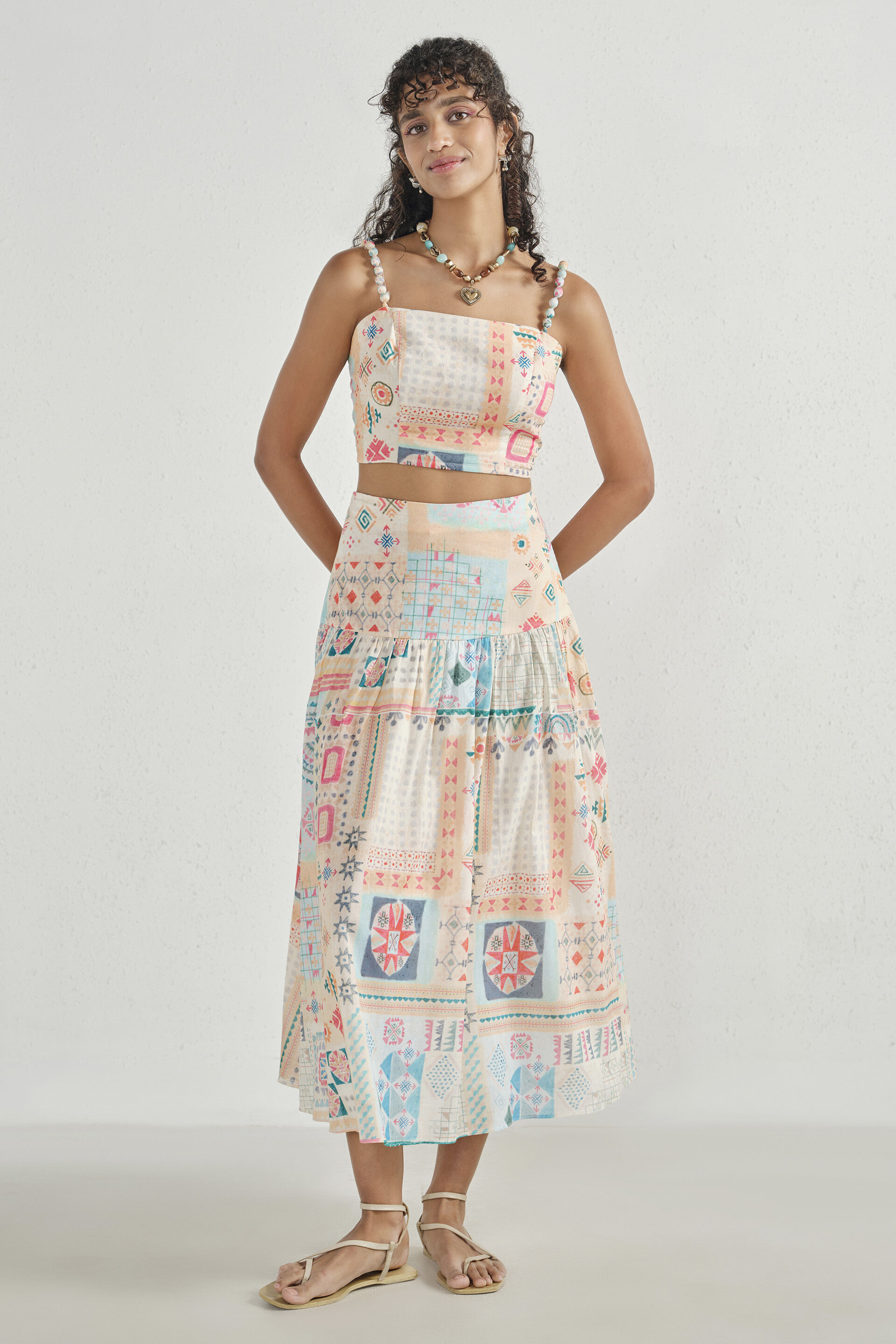 A white two piece set that comes with a printed, fitted crop top featuring beaded straps and a square neckline, paired with a printed midi skirt in a slip-in silhouette.