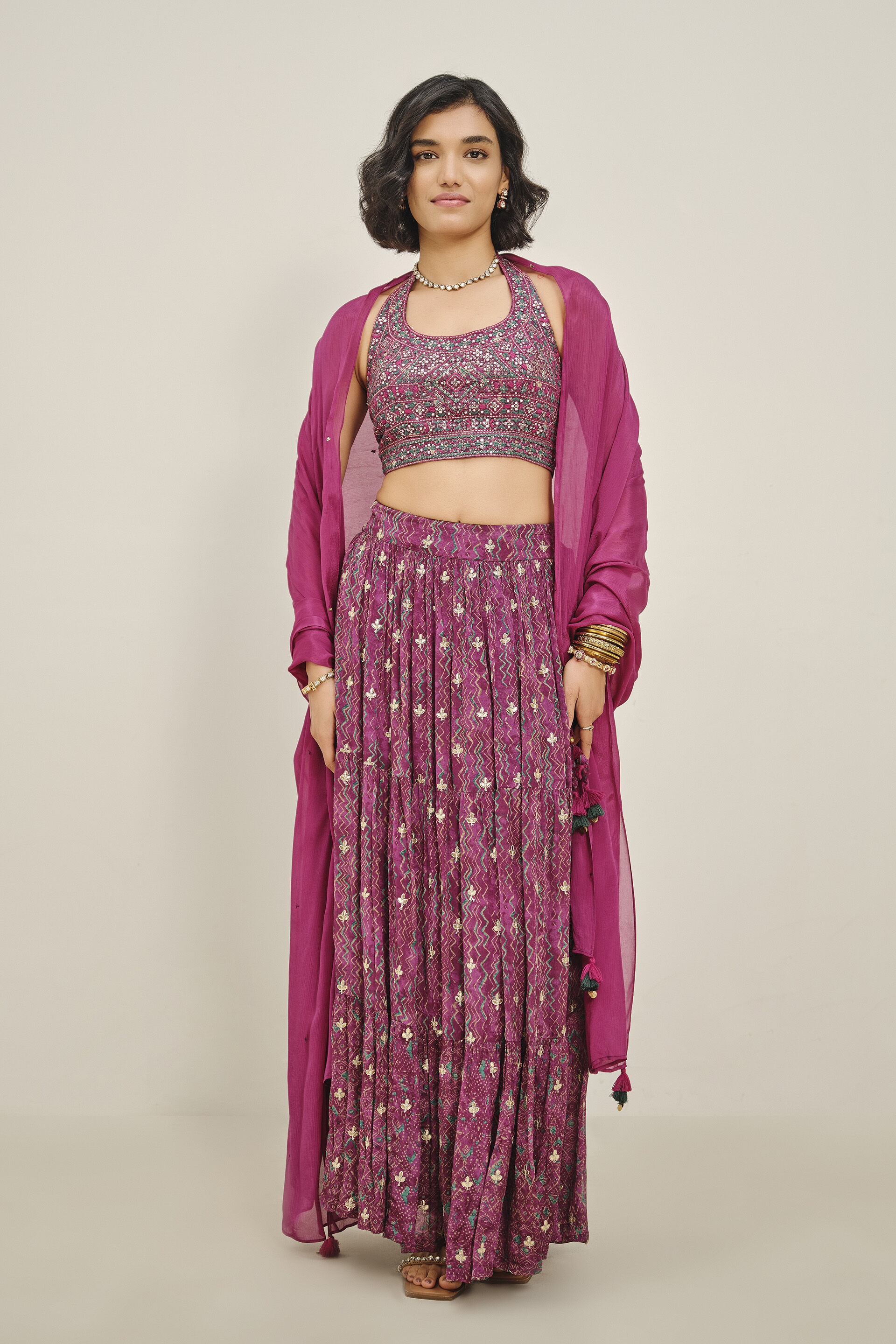 Make every moment a celebration with this three-piece set. The halter crop top, flared skirt, and flowy dupatta shimmer with embroidery that catches every light. Made for dancing through mehendi nights and music-filled hours.