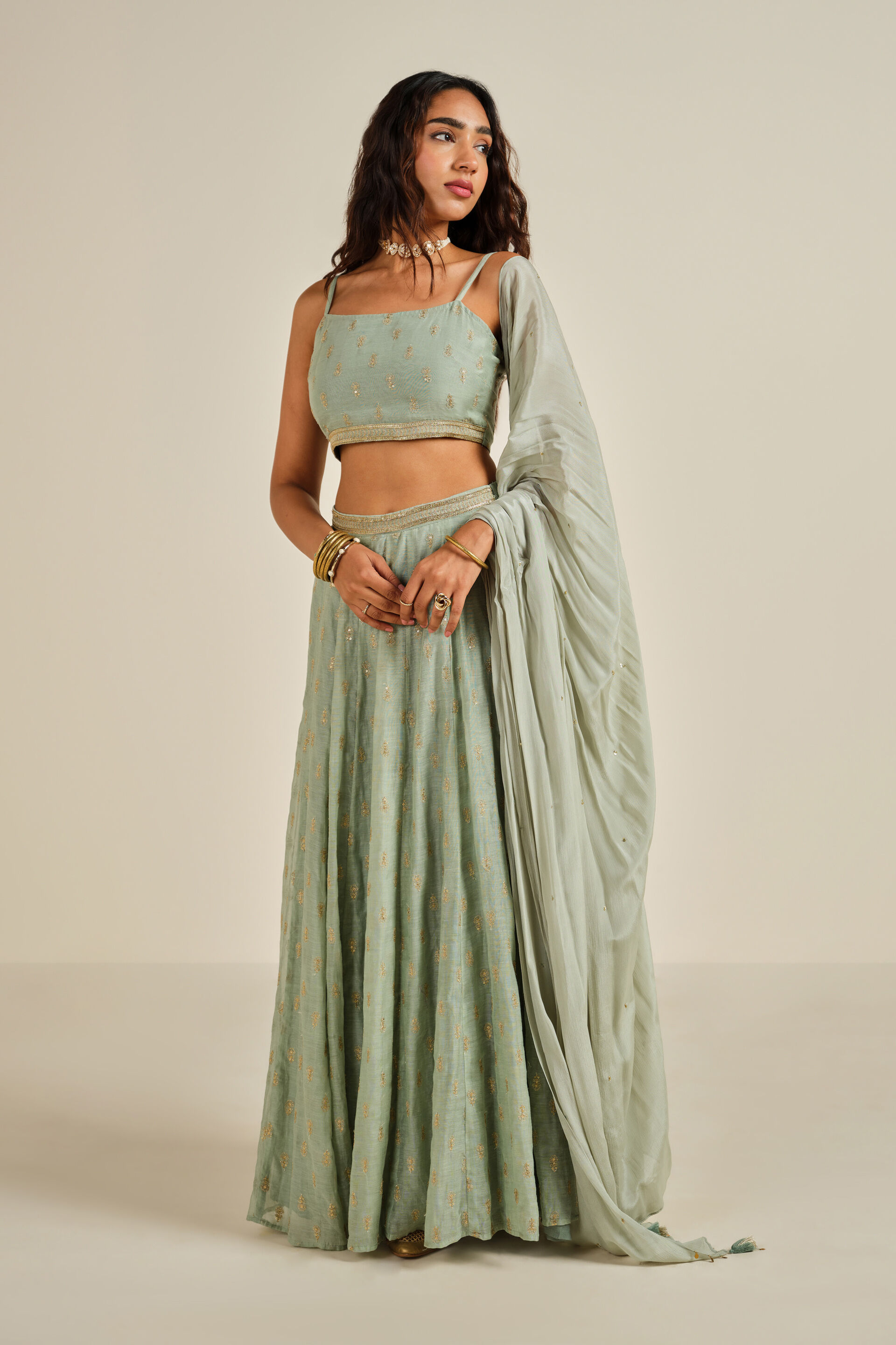 It comes crafted in soft malai chanderi for a breezy festive feel. With a strappy blouse, embroidered skirt, and a matching dupatta, this set blends easy elegance with just the right touch of celebration.