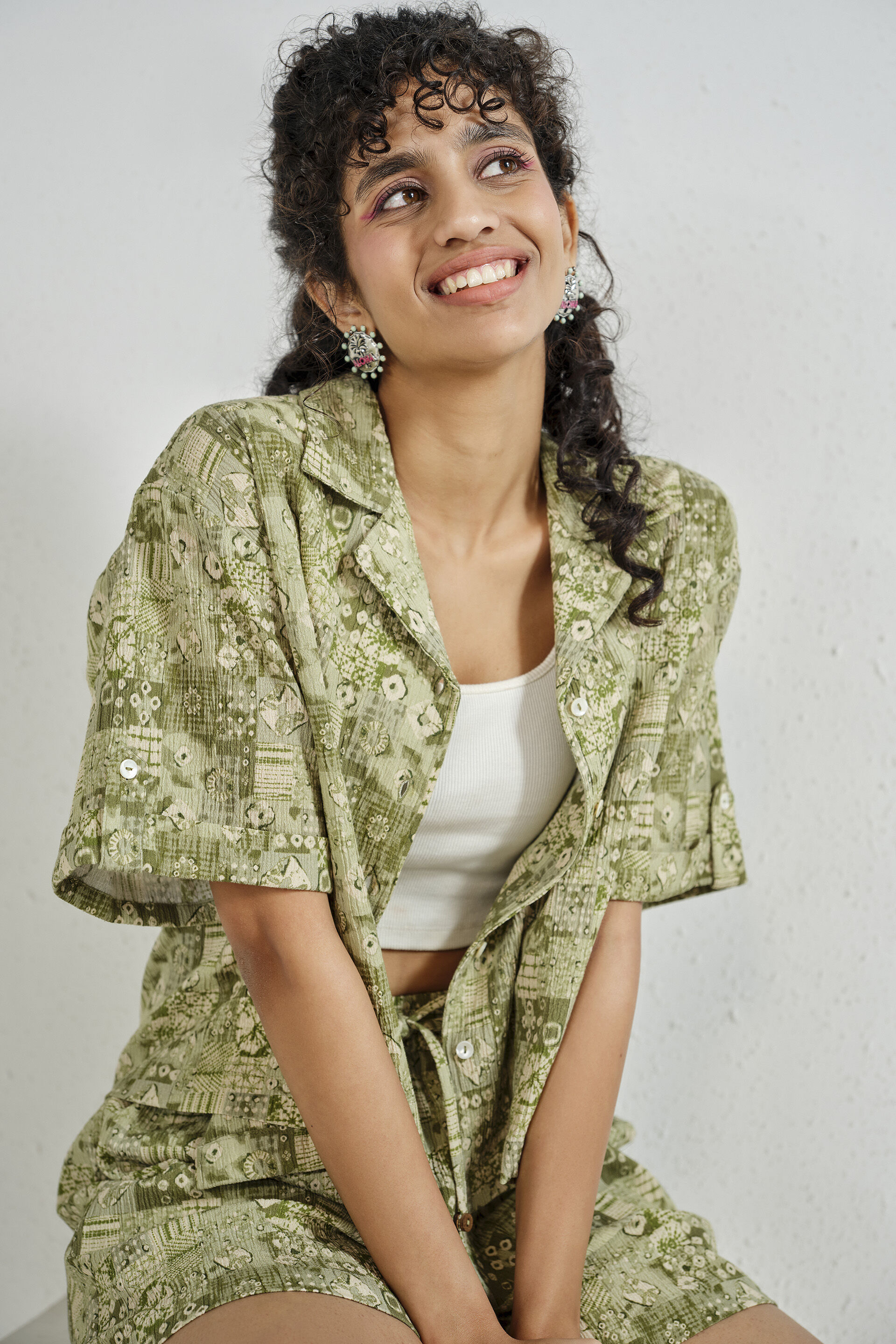 A printed two piece set in a cotton-linen blend. It comes with a sage boxy shirt featuring a collared neckline and button-up front, paired with pull-on shorts detailed with two pockets.