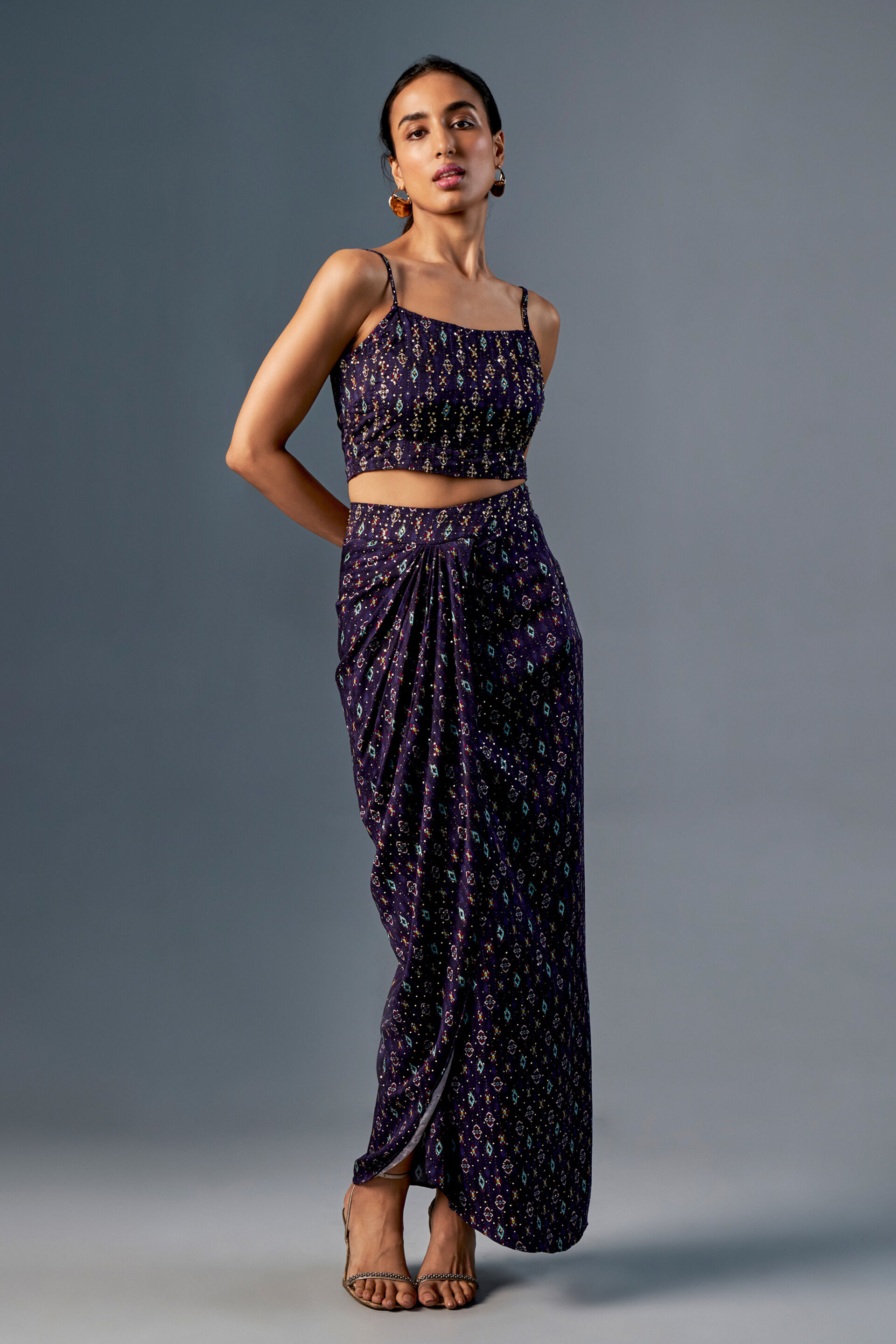 Featuring Ikat inspired print with gold foil highlight, this draped skirt co-ord gives everyone the illusion of being a draped saree. Complete with elasticated straps and smocking on the back, the top is as comfortable as comfort gets, and the jacket gives the entire look an elegant finish. So, whether it’s your bestie’s wedding or brother’s sagai, this 3 piece co-ord set is sure to be your first pick!