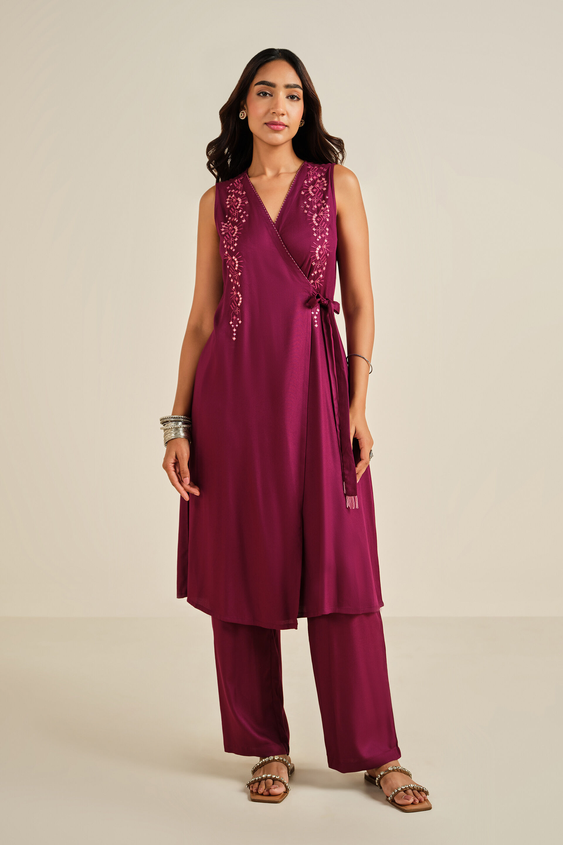 This indigo-hued set features a V-neck sleeveless kurta with a tie-up detailing at the front. It comes with matching straight-fit pants.