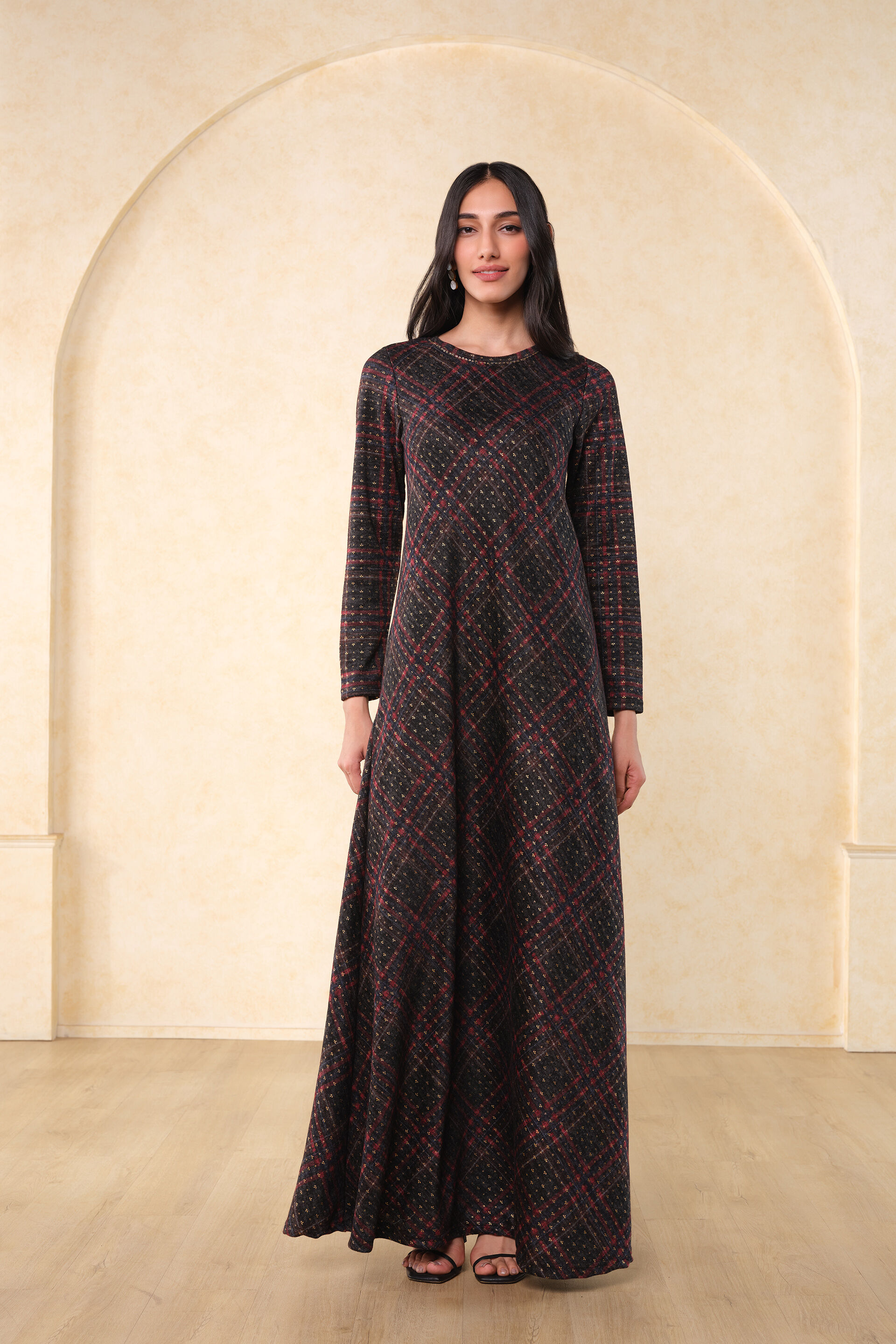 Dance through the winter nights in this circular maxi dress with full sleeves. This flared dress in grey features a check pattern and comes with gold highlights for a touch of glint. Style it up with a belt or glimmering accessories.