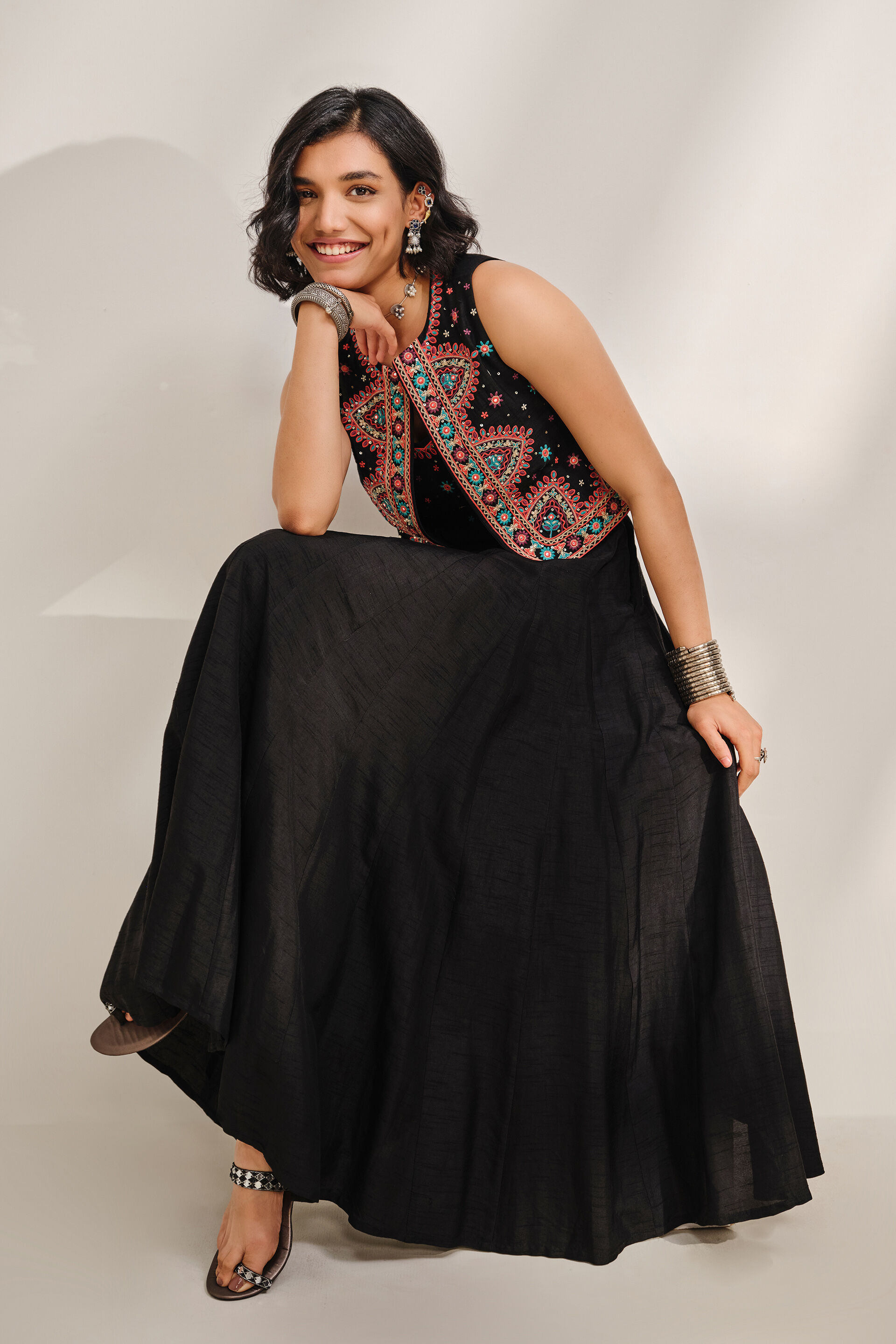 All things elegant and dramatic - this set features an embroidered maxi paired with a short crop jacket and dori belt. A blend of classic and contemporary, it’s made to shine under the lights of any celebration.