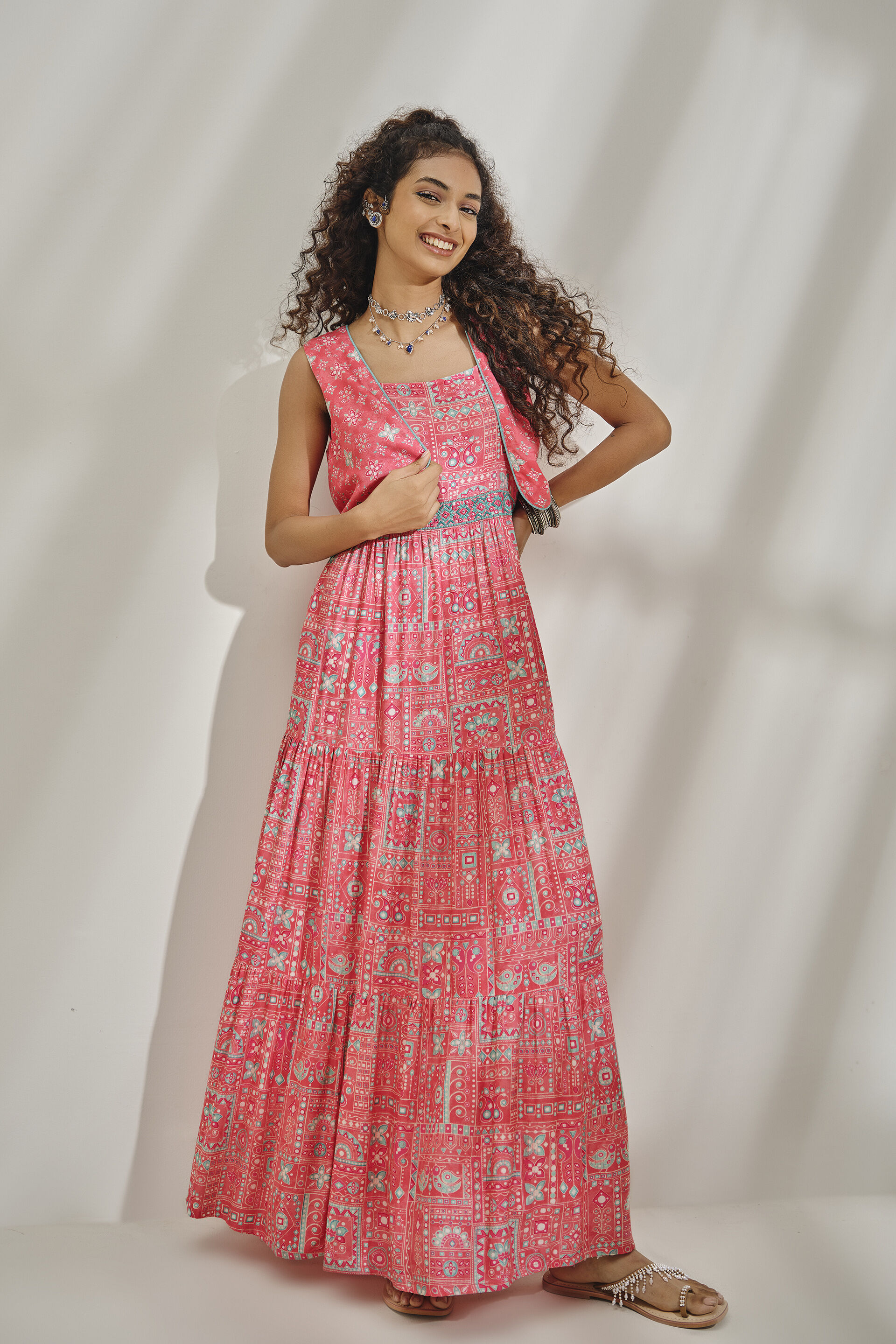 A striking coral evening wear set crafted to turn heads. The sleeveless maxi dress in a graceful A-line silhouette features a full-length slip-in design for effortless wear. Layered with a sleevless, cropped jacket showcasing a round neckline and subtle print, this two-piece ensemble blends elegance with contemporary flair.