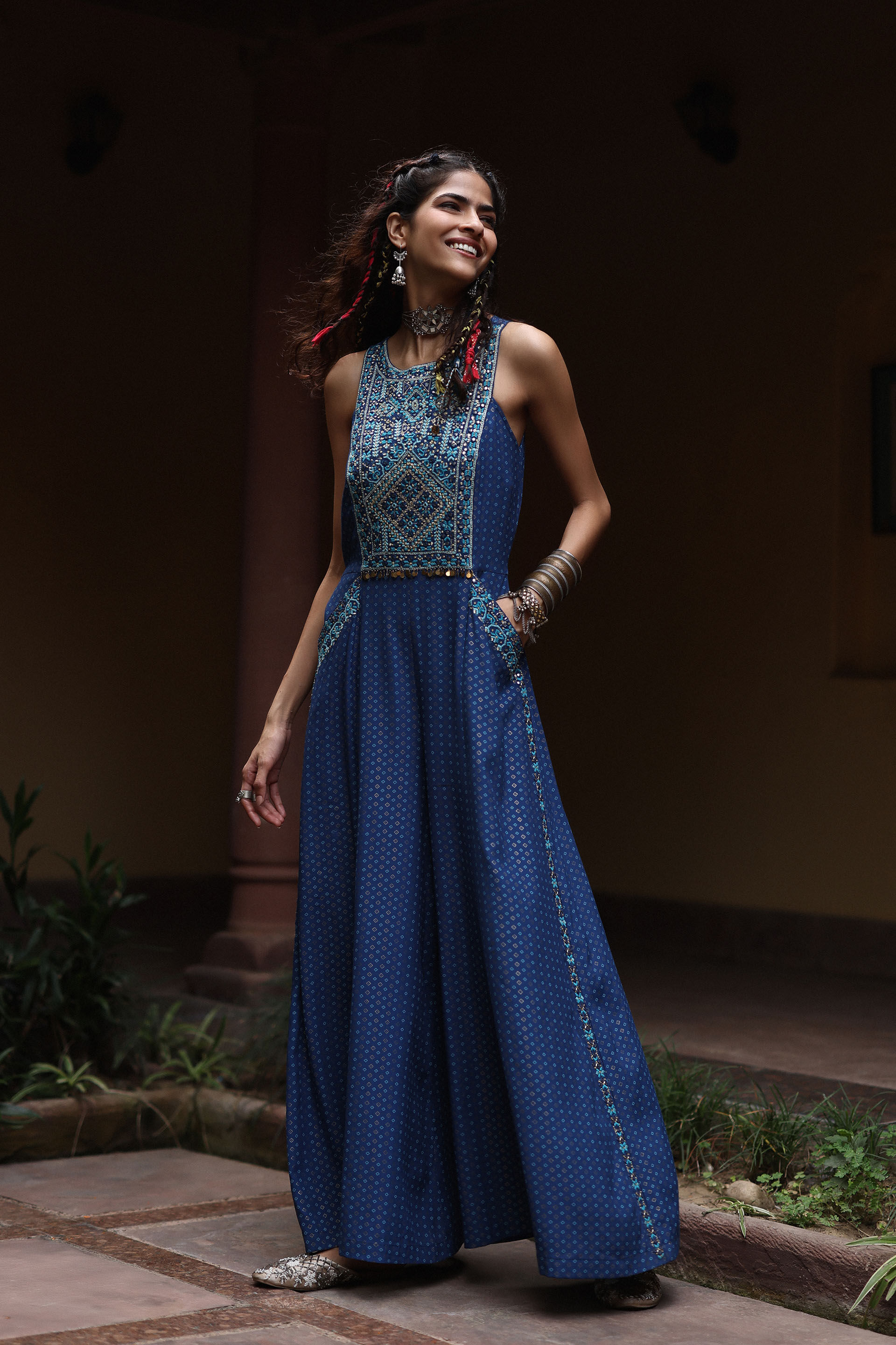 A striking blue jumpsuit with an in-cut design makes this one perfect for celebrations round the day. Crafted from breathable & lightweight viscose, it features India-inspired prints & elaborate embroidery. Dance with delight or be your demure self in this eclectic jumpsuit that comes with pockets.