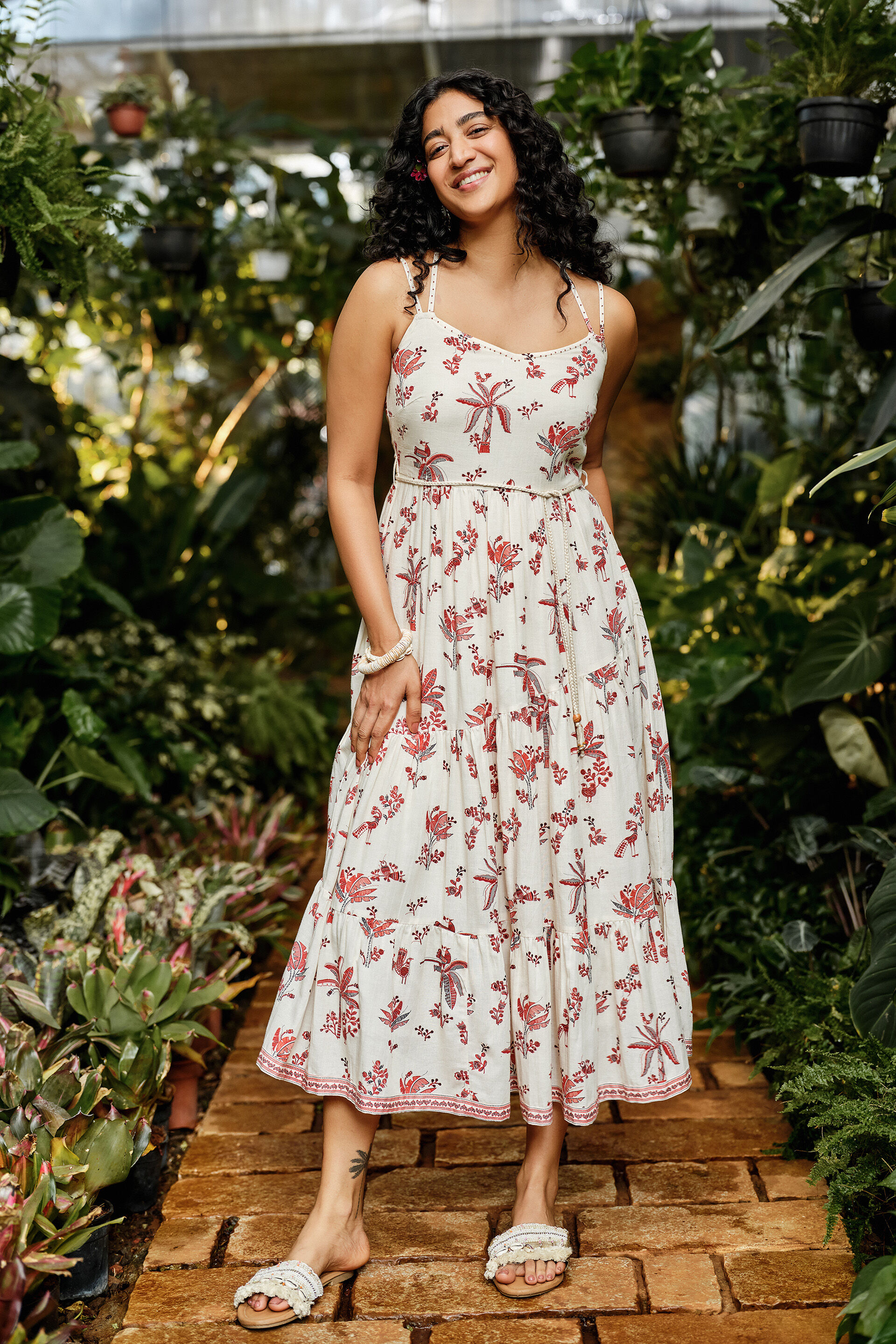 A natural-toned tiered midi dress with a straight silhouette, V-neckline, strappy design, mid-calf length, and pink floral print.