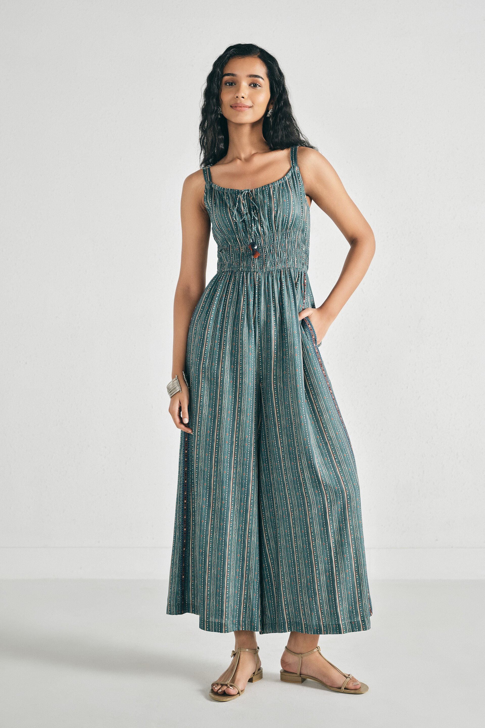 A blue wide-leg jumpsuit designed with a smocked waist, square neckline, front tie detail, spaghetti straps, wide legs, and two pockets.