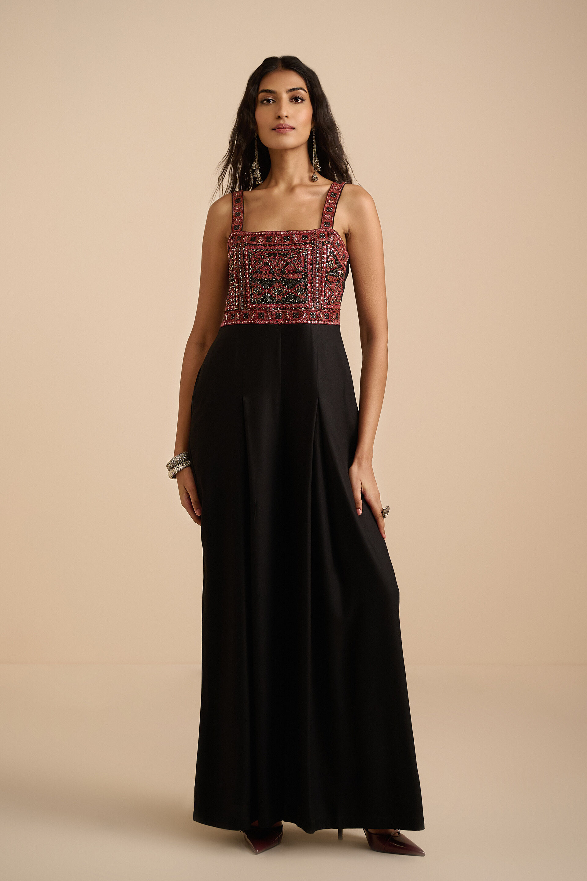 Designed with a square neckline, straight A-line fit, and a streamlined silhouette, this jumpsuit blends minimal elegance with ease. The concealed zip closure at the back ensures a seamless finish, making this versatile piece perfect for evening gatherings.