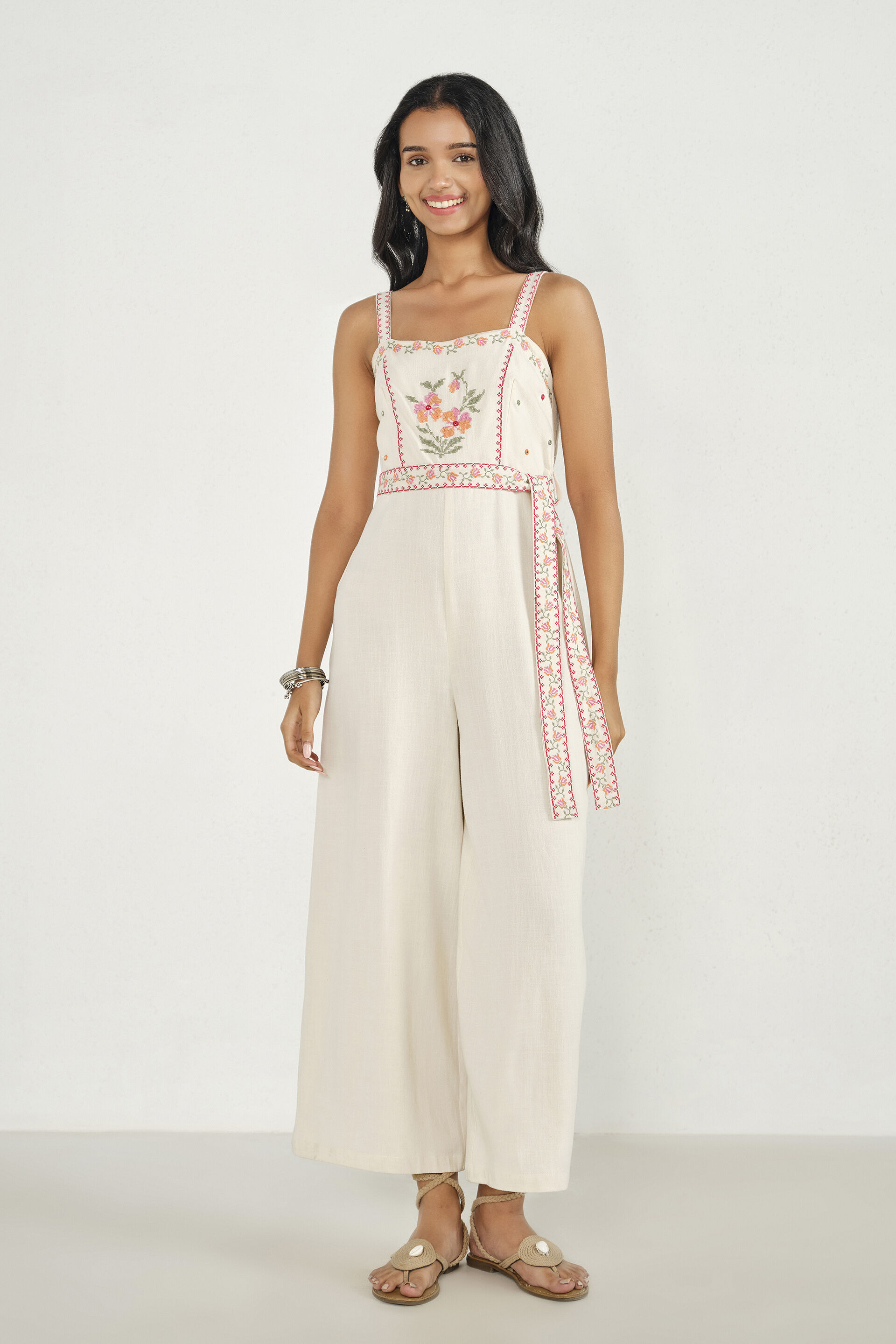 An off-white wide-leg jumpsuit featuring floral embroidery, a square neckline, strappy silhouette, full-length straight fit, and zip-up closure. Comes with a detachable belt with beautiful floral detailing and tassles.