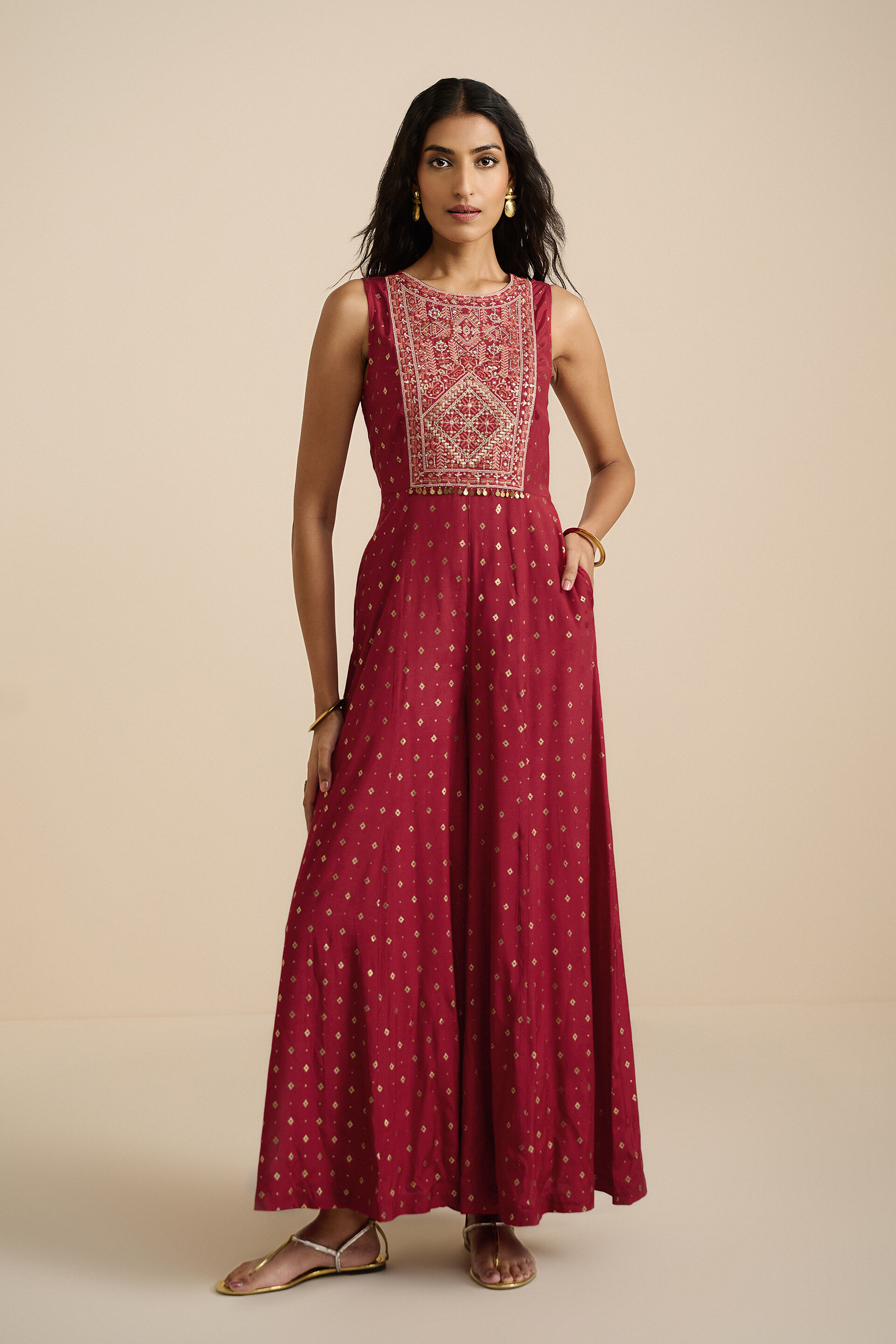 Red brings out your natural beauty, and our printed jumpsuit is the perfect fit for festive occasions. Its full-length straight A-line fit allows breezy movements, and you can enjoy the festival to the fullest.