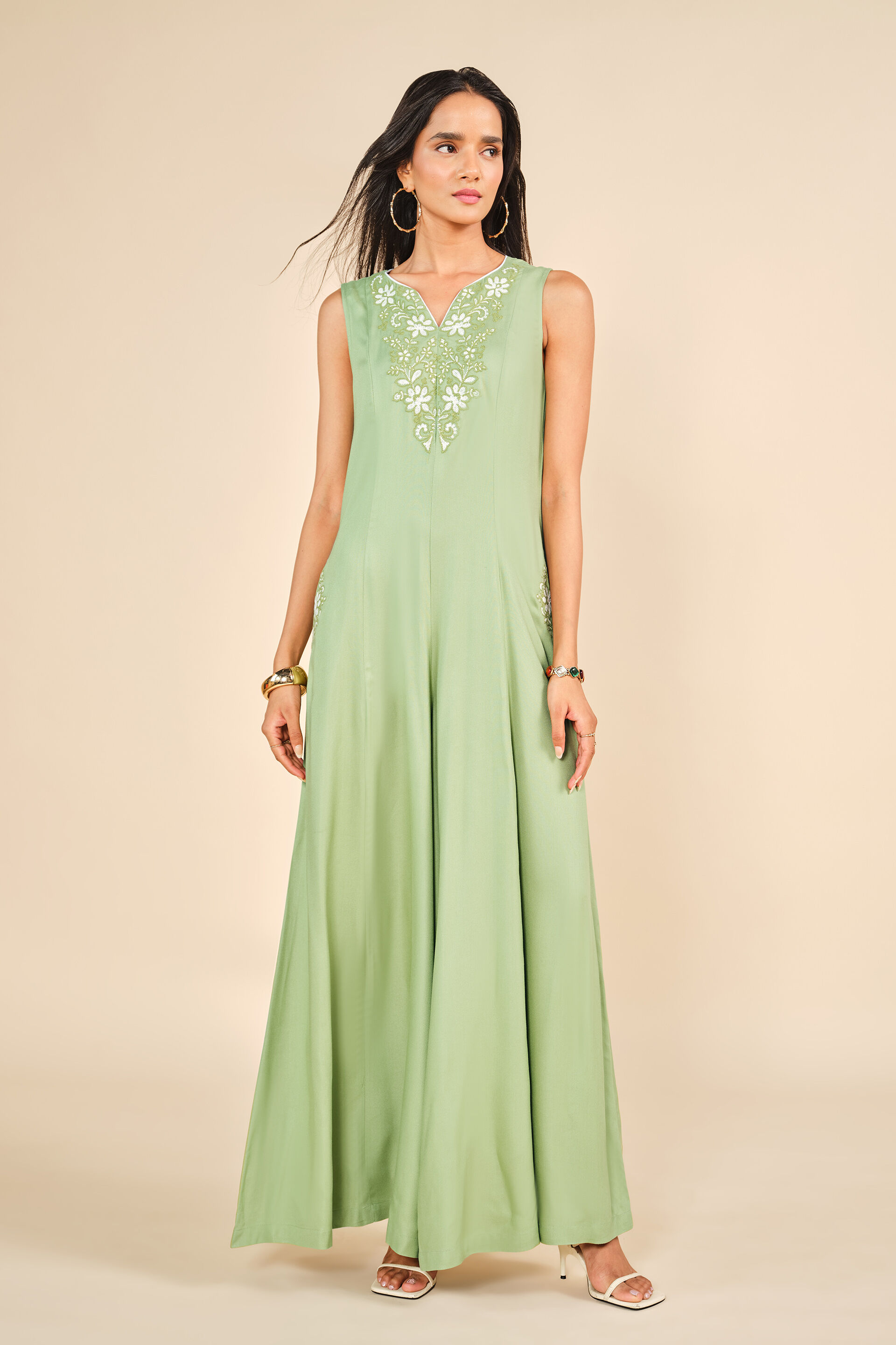 Add a touch of playful fun to your festive looks with this sage jumpsuit.