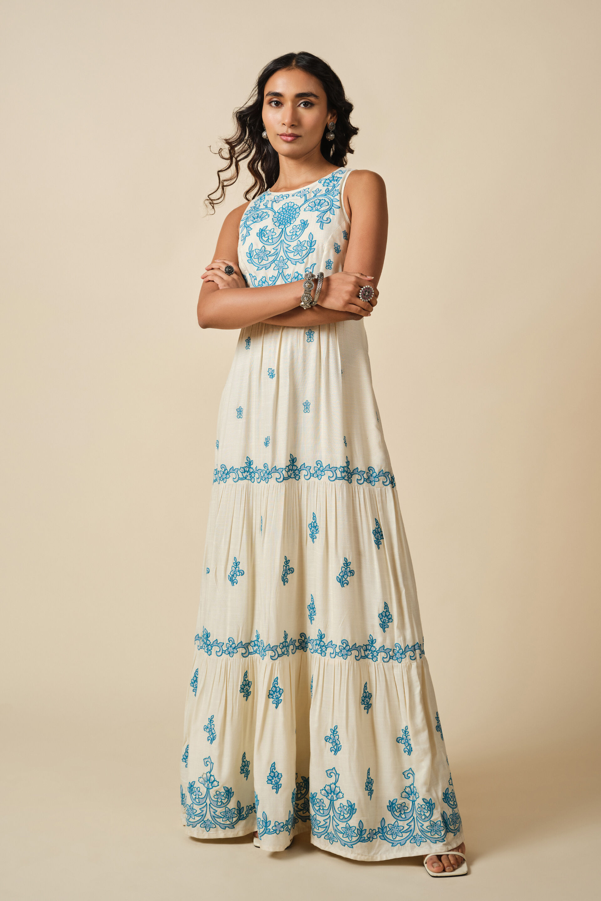 Featuring India-inspired prints, this breezy maxi dress is all you need for the sweltering summer months. Crafted in soft & flowy viscose fabric, it features multi-hued India-inspired embroidery that adds a burst of colour & elegance to your look. With its flowy fit-and-flare silhouette, this dress combines artistry and grace for a stunning & timeless look. Explore the city, pose for a picture or twirl delightfully in this maxi dress.
