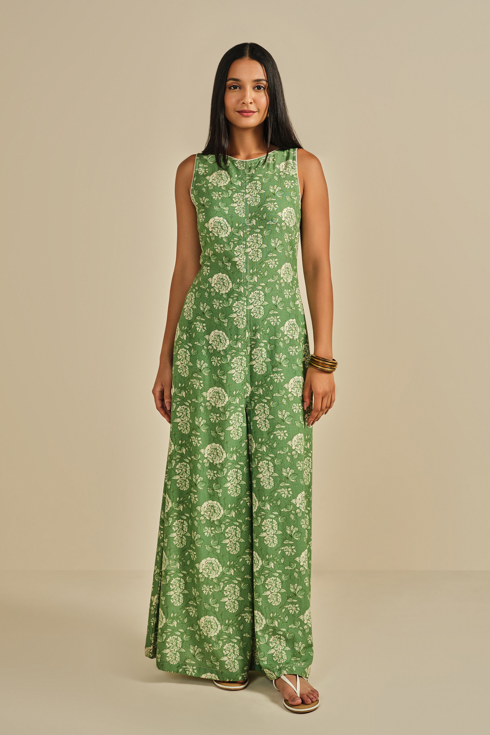 Make a style statement at any occasion with our green jumpsuit. Featuring India-inspired prints & contasting piping details, this jumpsuit comes in a fit-and-flare silhouette with a boat neckline. Style it with metallic heels & fluid metal earrings to look chic.