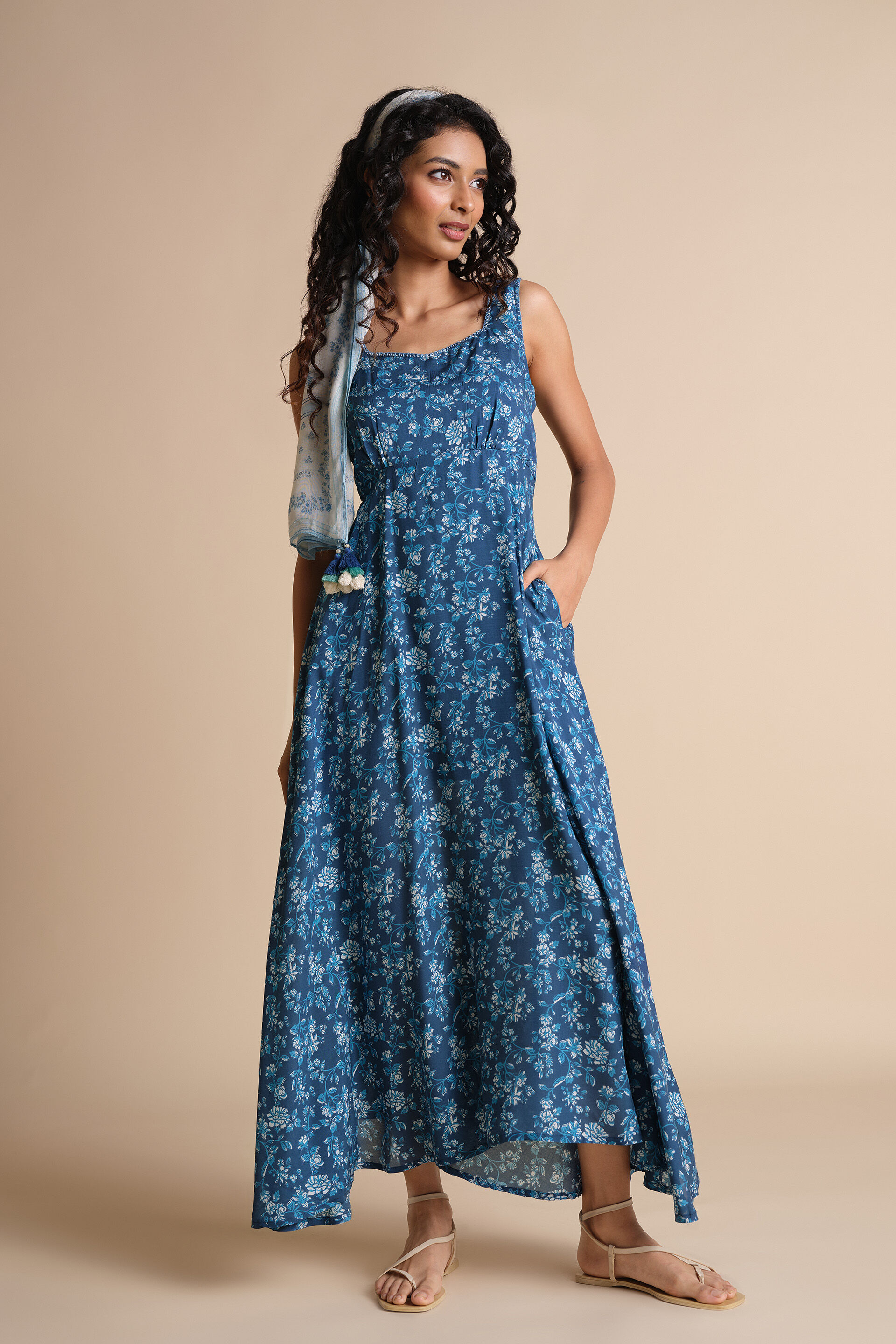 Step out in this fun & frolic-inspired dress that is perfect for summer getaways. Featuring a classic fit-and-flare silhouette, this dress comes with all-over floral prints and a slit for effortless movement. Crafted in viscose, this dress comes with minimal hand-embroidered details & a smocking at the back making it an elegant & playful dress.