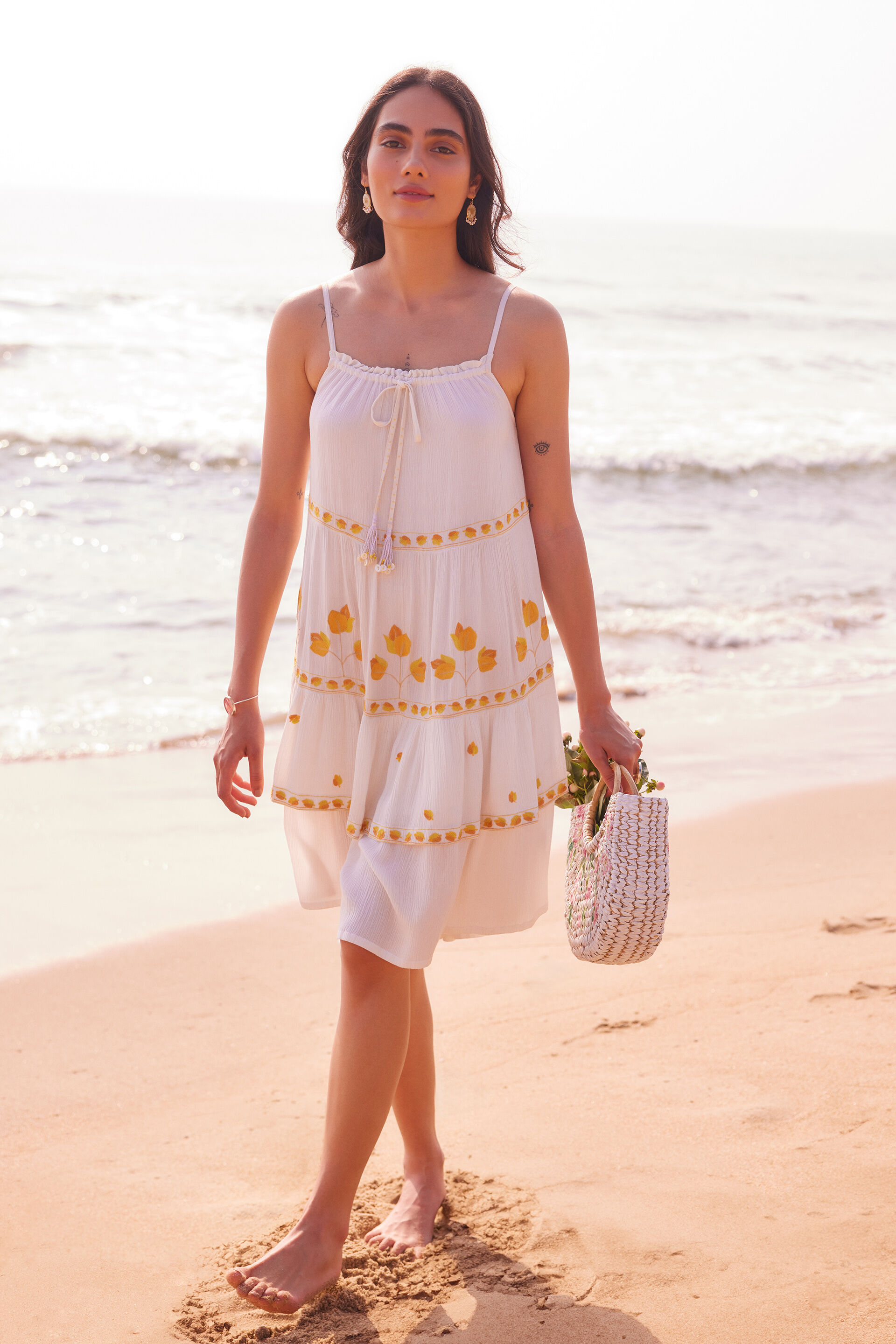 Perfect for summer, this floral dress features aari embroidery and India-inspired prints. Designed in soft & breathable viscose fabric, this dress feels soft & breathable on your skin. Featuring a tie-up detailing on the neckline, you can pair this dress with beaded fruit earrings for a touch of vibrance.
