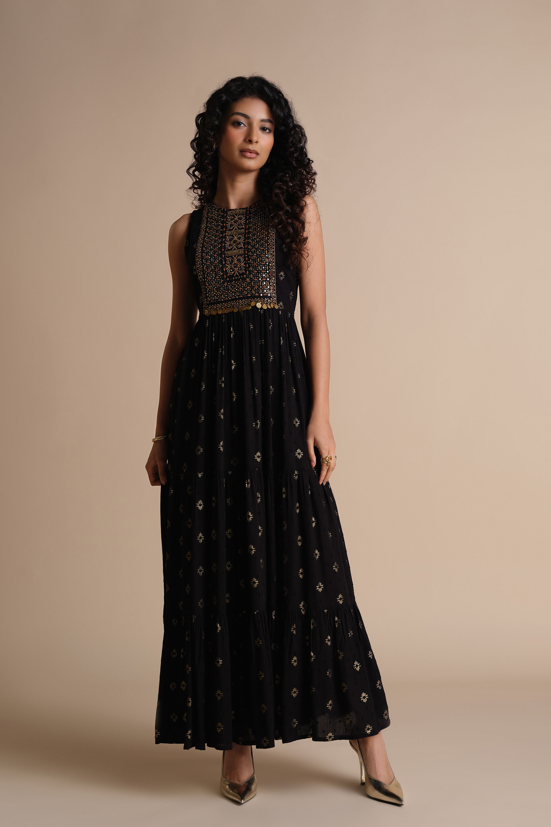 Get ready to party in this stunning black maxi gown. Embrace the elegance of this ethnic maxi dress featuring a gold foil print on a soft & flowy viscose fabric base. The tiered dress comes with in-cut sleeves and an intricately embroidered yoke. Perfect for festive events, glimmering celebrations & glamorous soirees, this gown is a standout piece that blends tradition with contemporary style.