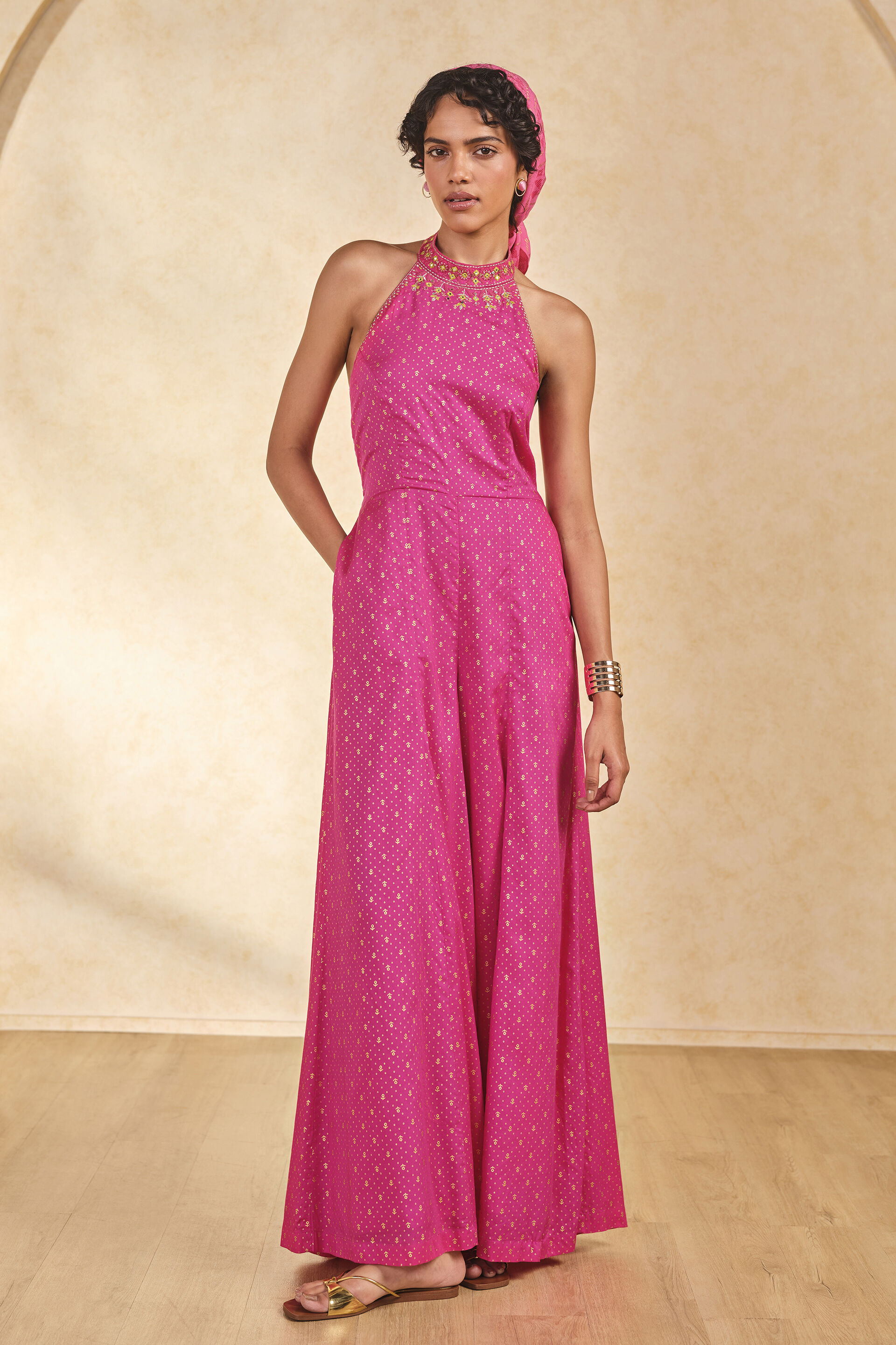 This chic jumpsuit in viscose features an India-inspired gold foil print and an embroidered halter neckline. Perfect for cocktail parties and evening events, it blends comfort with sophistication. Style it up with a pair of block heels to complete the look.