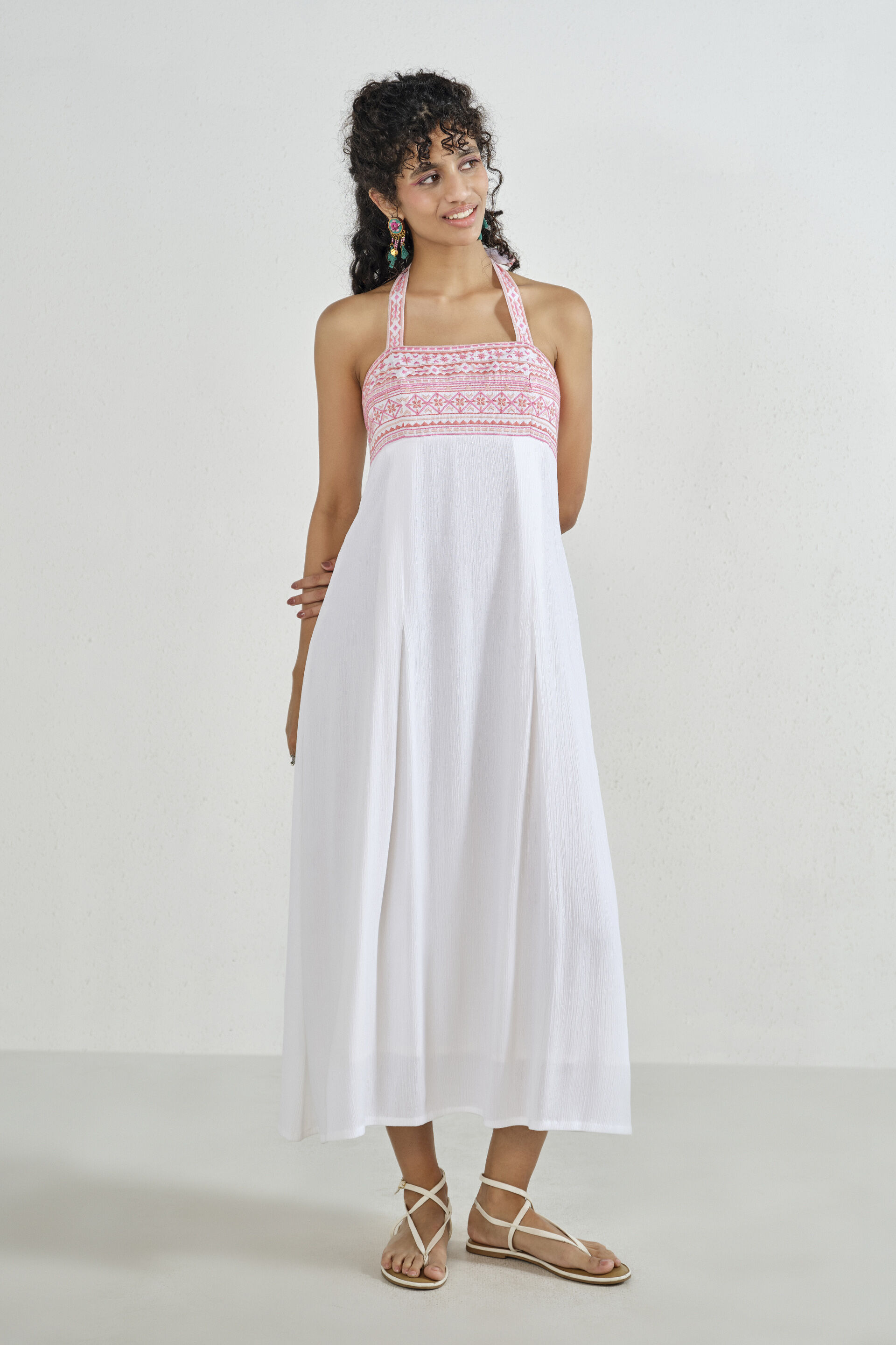 A white halter midi dress featuring pink embroidery, a square neckline, mid-calf length, straight silhouette, and slip-in fit.