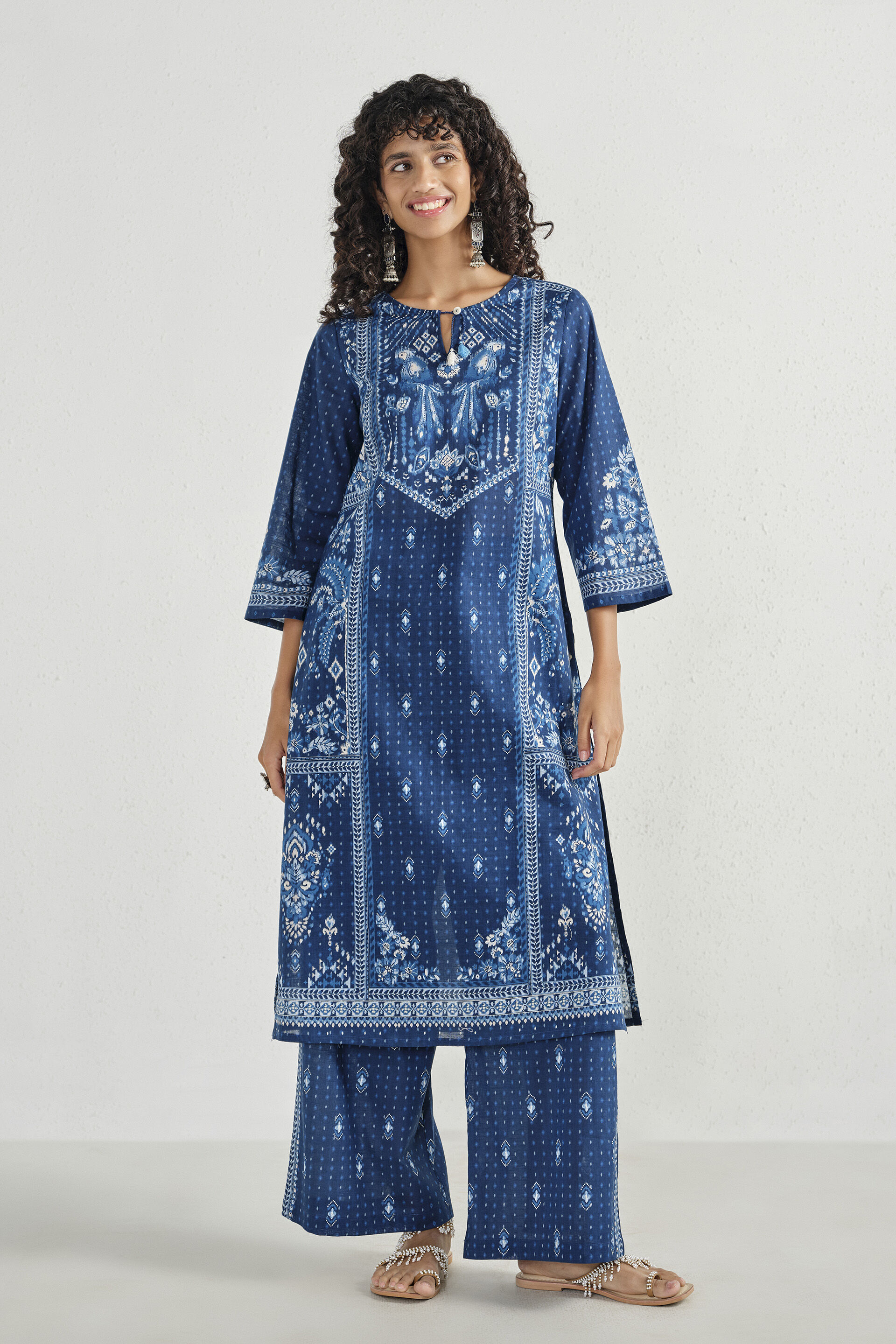 A two piece set that comes with an indigo printed placement straight kurta featuring a round neckline with slit and three-quarter sleeves, paired with straight slip-in pants.
