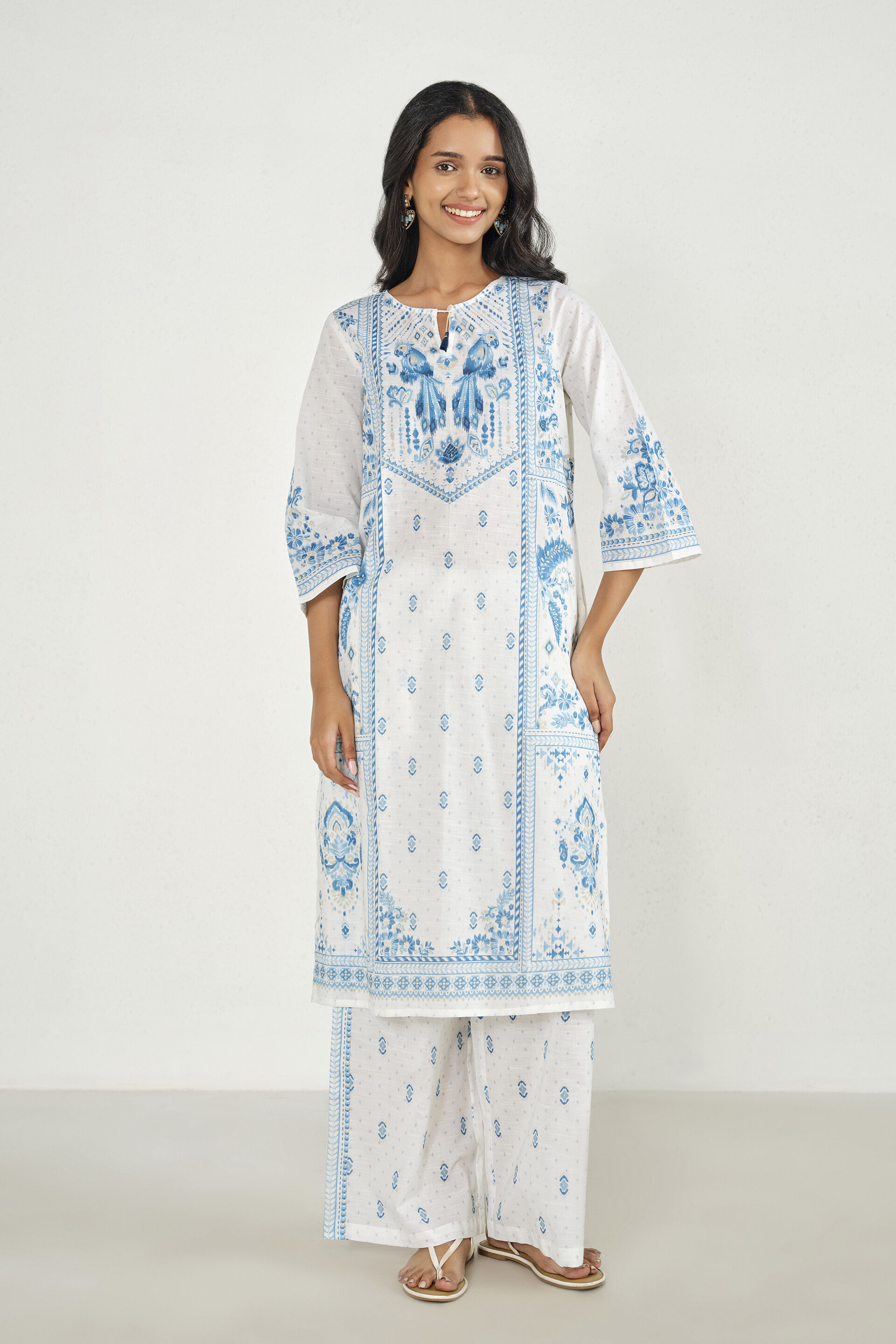 A two piece set that comes with a white printed placement straight kurta featuring a round neckline with slit and three-quarter sleeves, paired with straight slip-in pants.