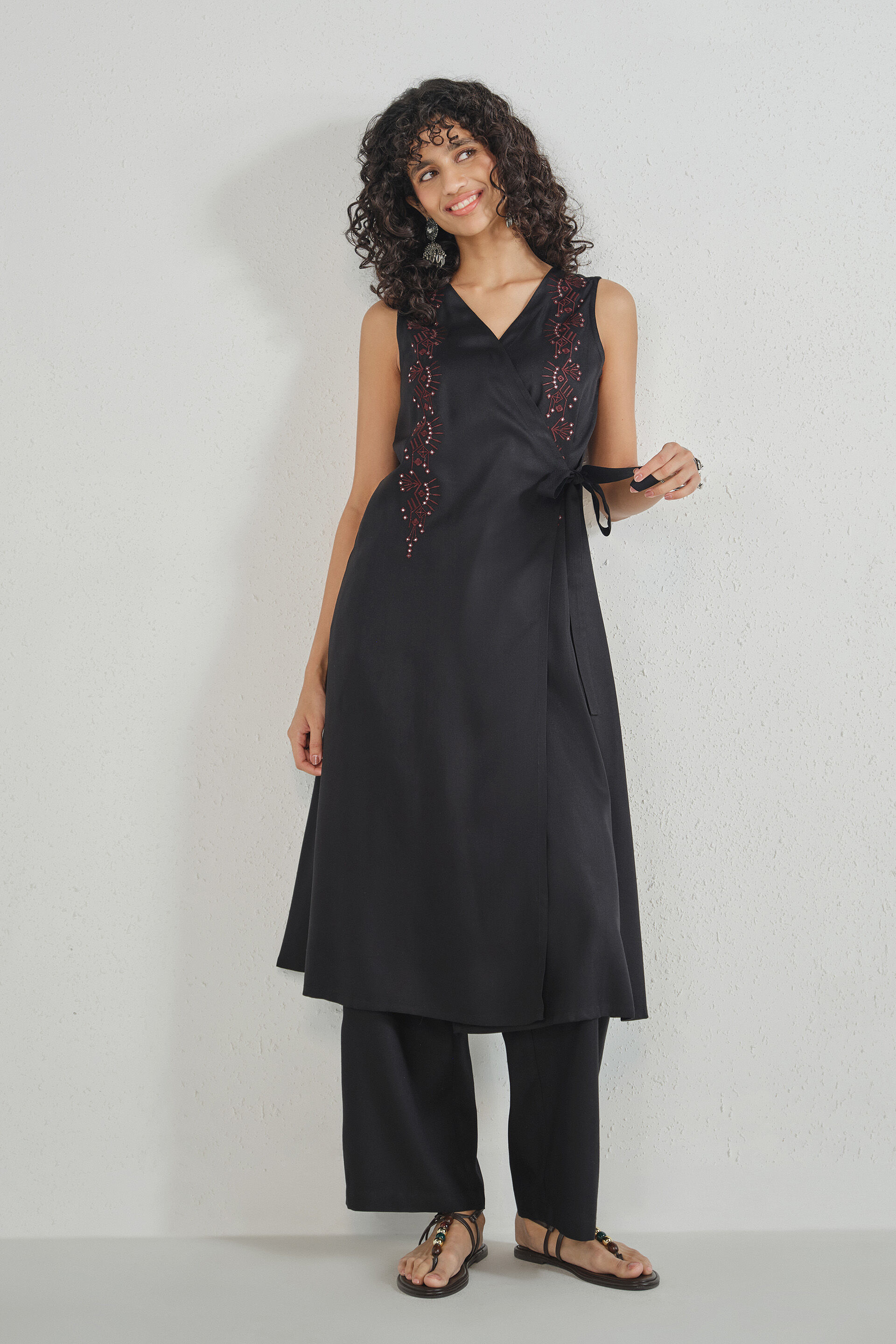 A two piece set that comes with a sleeveless black embroidered overlap kurta featuring a V-neckline and straight silhouette, paired with straight full-length pants detailed with two pockets.