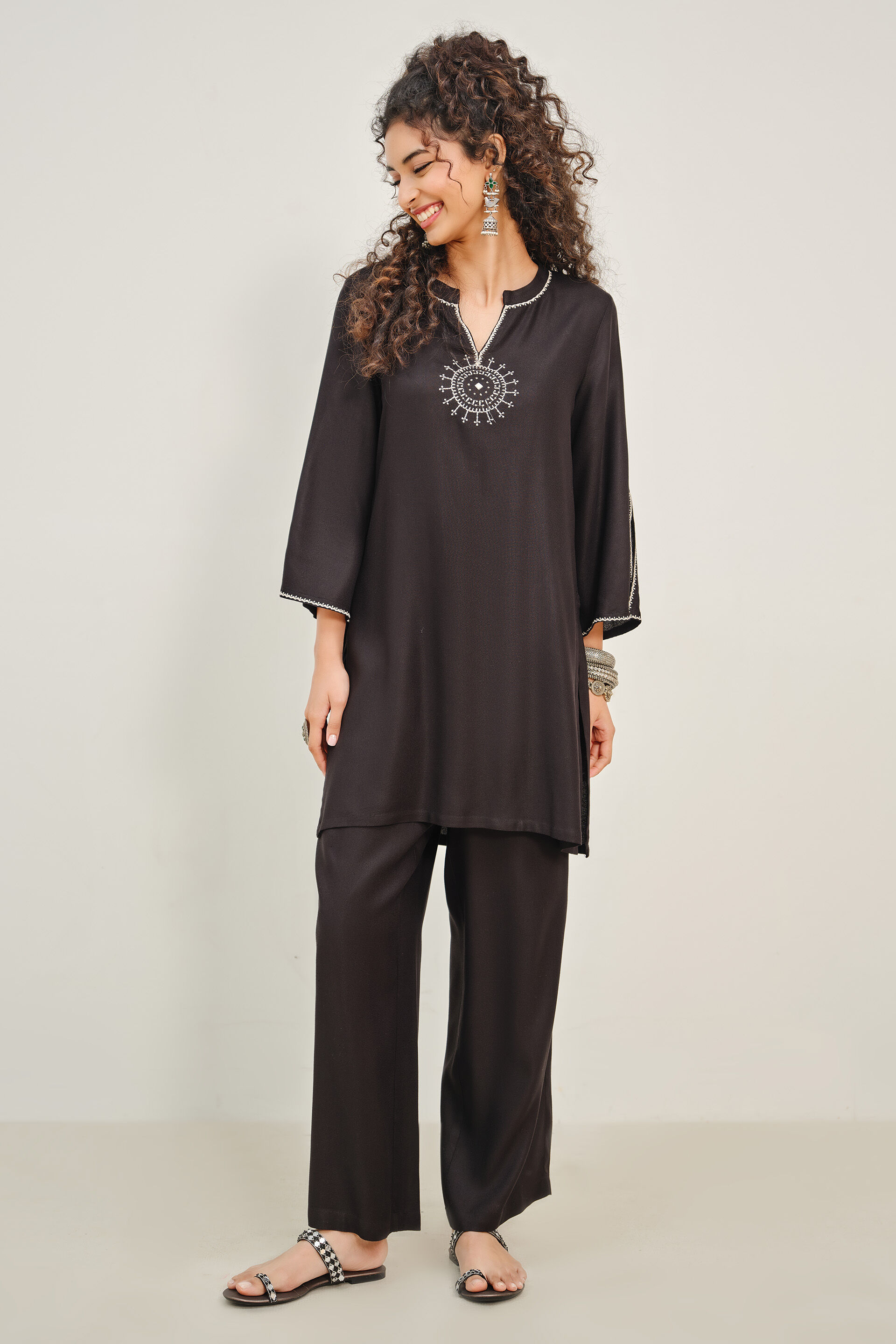 As timeless as a koyal’s song, this black set pairs a straight kurta with easy pants, detailed with kantha embroidery at the neckline. Perfect for days when effortless style is all you need.