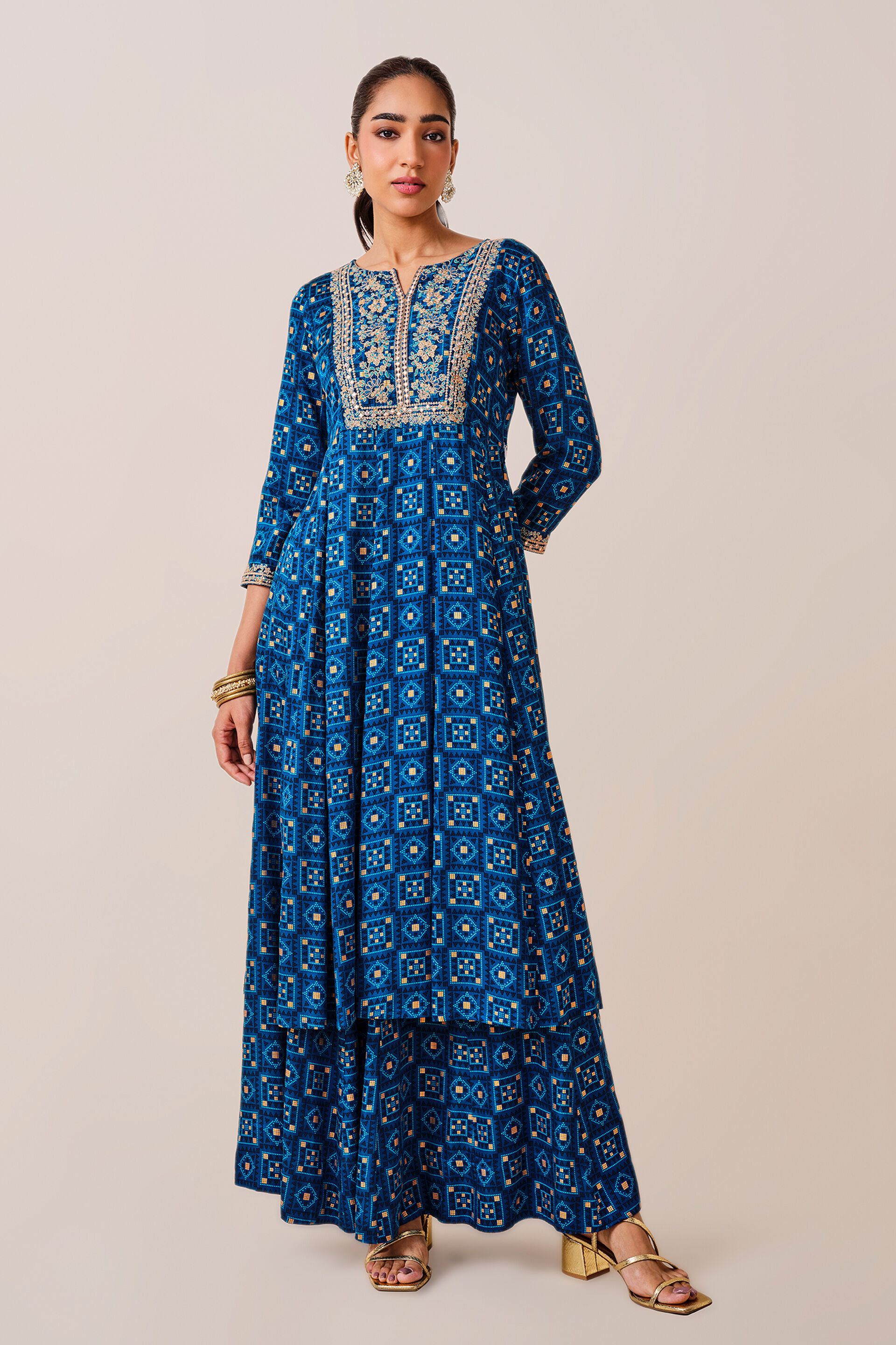 This set showcases a statement India-inspired print all over with intricate sequin embroidery on the neckline. Made with modal satin, it features a flared skirt and straight kurta duo. It's crafted with 100% viscose. The skirt is designed with two convenient pockets and a concealed zip for a seamless finish.