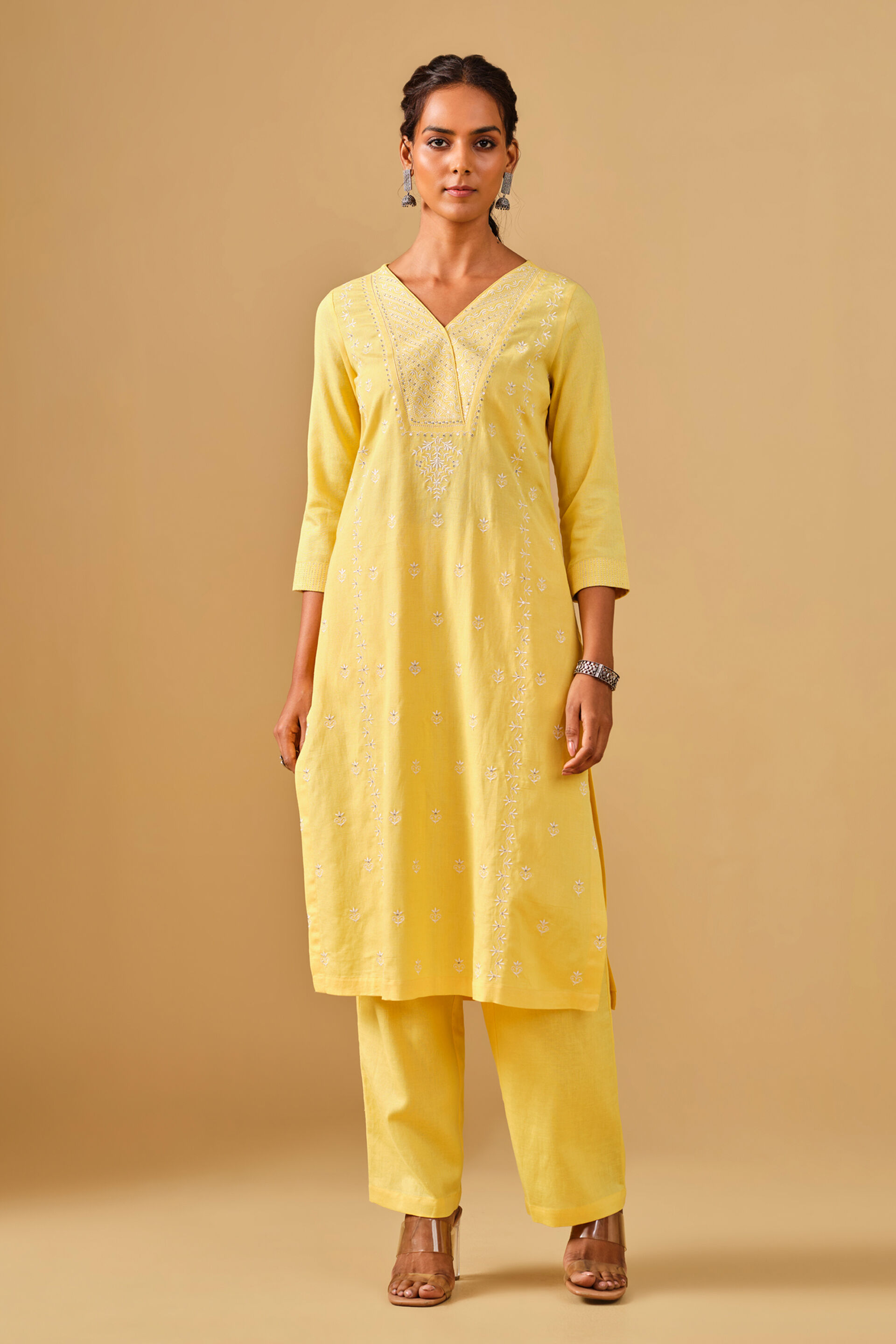 Be bright, cheery and fun with your style in this 2-piece kurta set. Featuring delicate thread work and sequin embroidery on the straight fit kurta, this set comes with a pair of simple pants with 2 pockets for a perfect look for a day out.