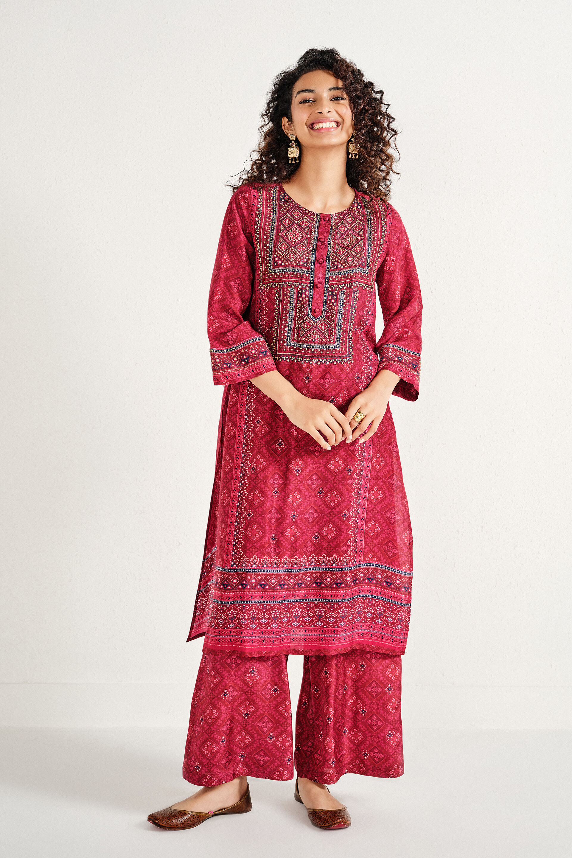 A printed knee-length kurta with a round neckline and three-quarter sleeves, styled with straight pants in an easy silhouette.