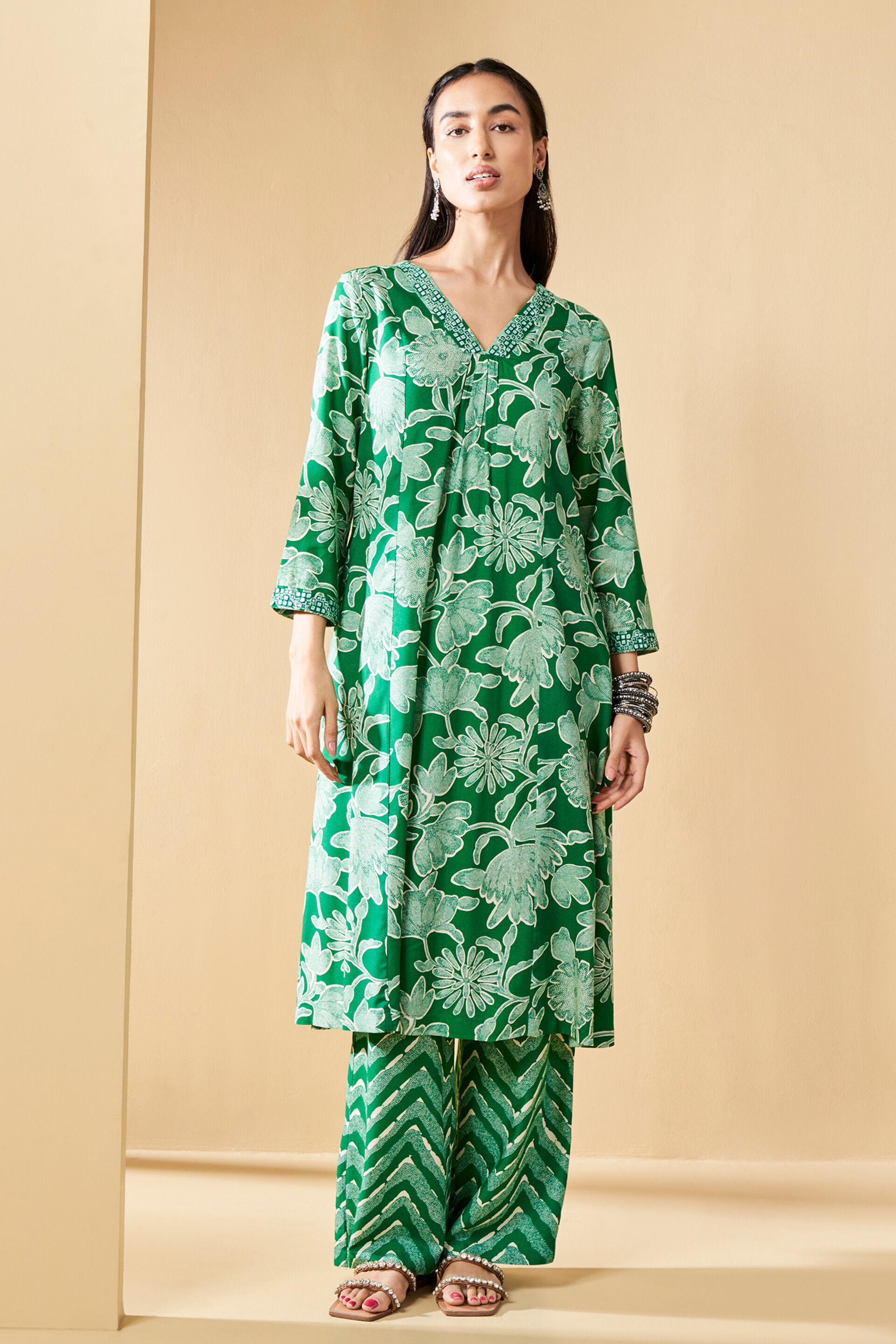 Crafted using 100% responsibly sourced, biodegradable EcoveroTM viscose, this set features a flared trapeze fit kurta with ethnic motifs and straight fit pants. Highlighted with embroidery, this set is perfect for those hangouts with your friends!