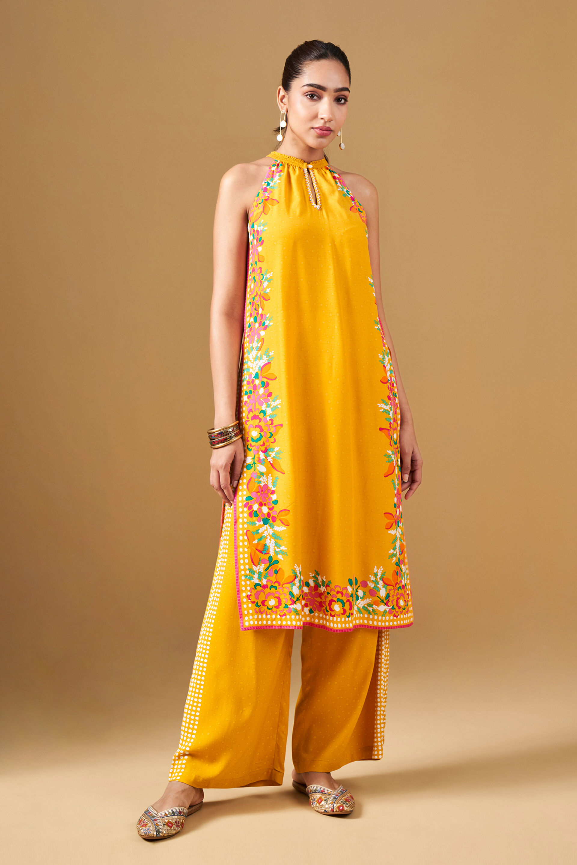 Featuring bold floral print along the border of the halter-neck kurta, this set is all about adding the drama to your style when you least expect it. This kurta set has been crafted using 100% viscose.