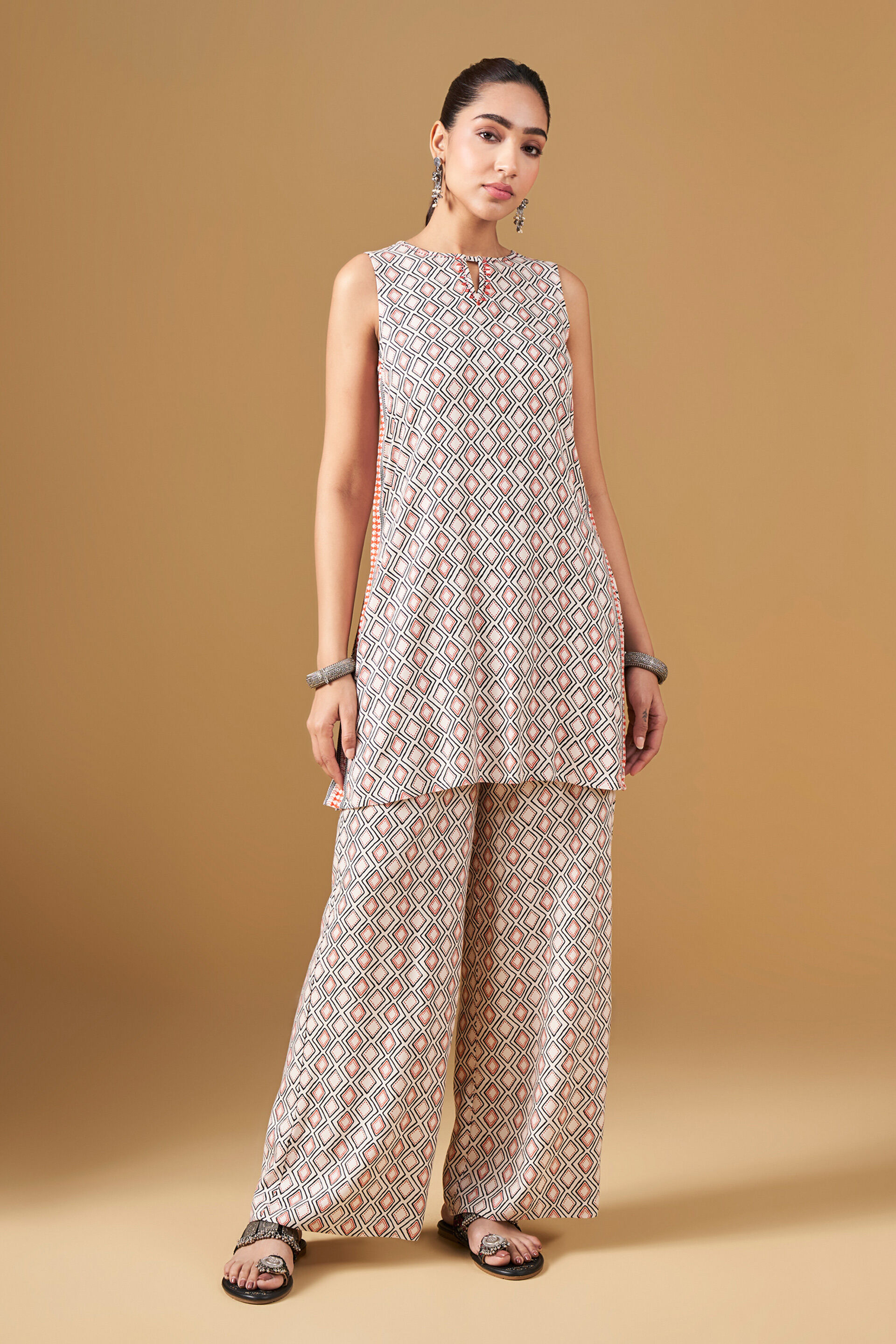 It’s all about feeling light this summer and this 2-piece kurta set will help you do just that. Featuring geometric print on a tunic-style kurta with cutout details and Warli inspired detailing on the slits and palazzos to match, this set is crafted using 100% viscose.