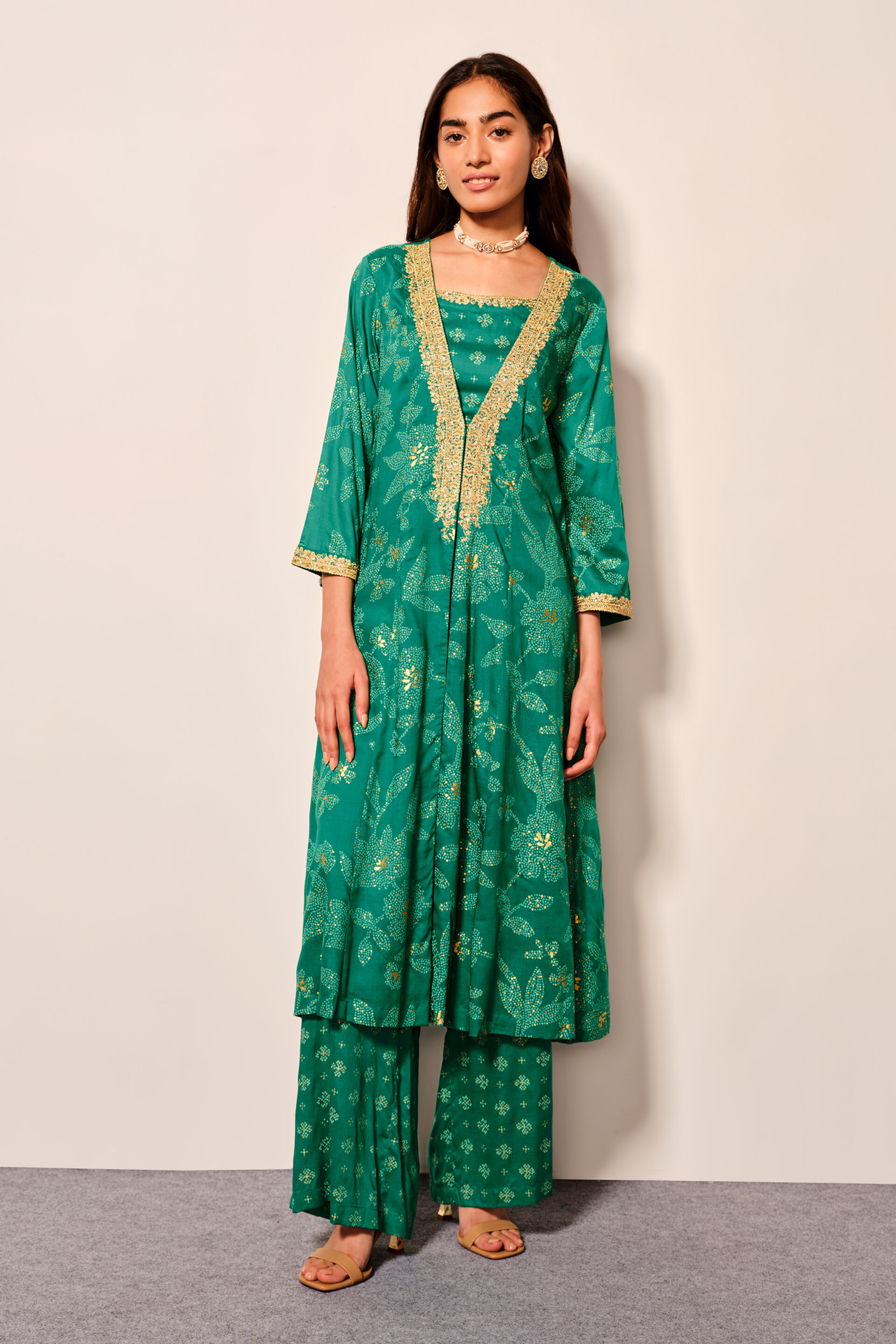 Green Jacket-Style Viscose Kurta Set In Leafy Print