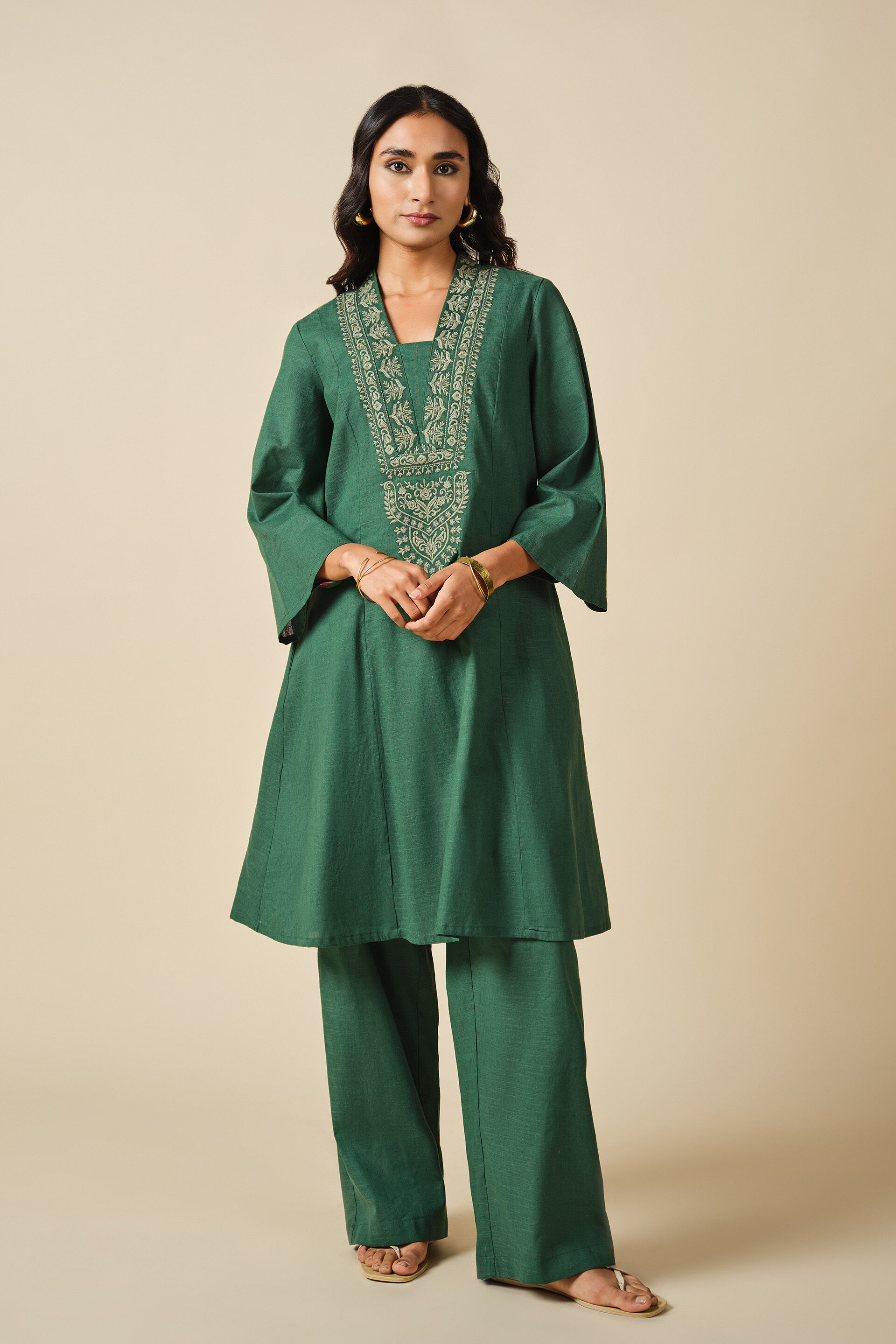 Elevate your everyday style with our Green Khumar Co-ord. Crafted in a soft & breathable cotton linen blend, this set features India-inspired embroidery on the neckline for a touch of elegance. Perfect for warm weather styling, this ensemble comes in an A-line silhouette with three-quarter sleeves and a V-neckline. Style this set with wooden jewellery to look chic & refined.