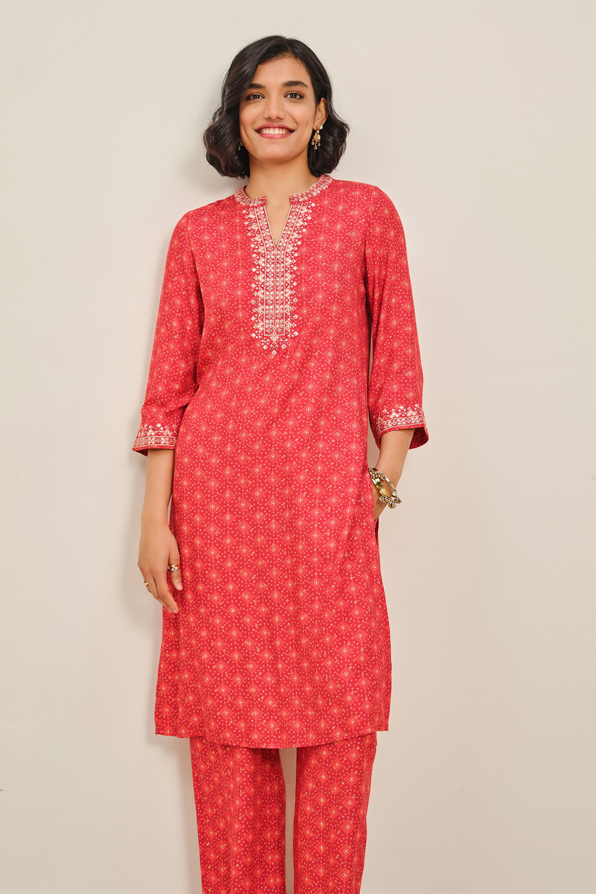 A celebration in red - this set pairs a printed band-collar kurta with straight pants. With its flowy fit and touch of embroidery, it’s perfect for morning functions or family gatherings that stretch into evening.