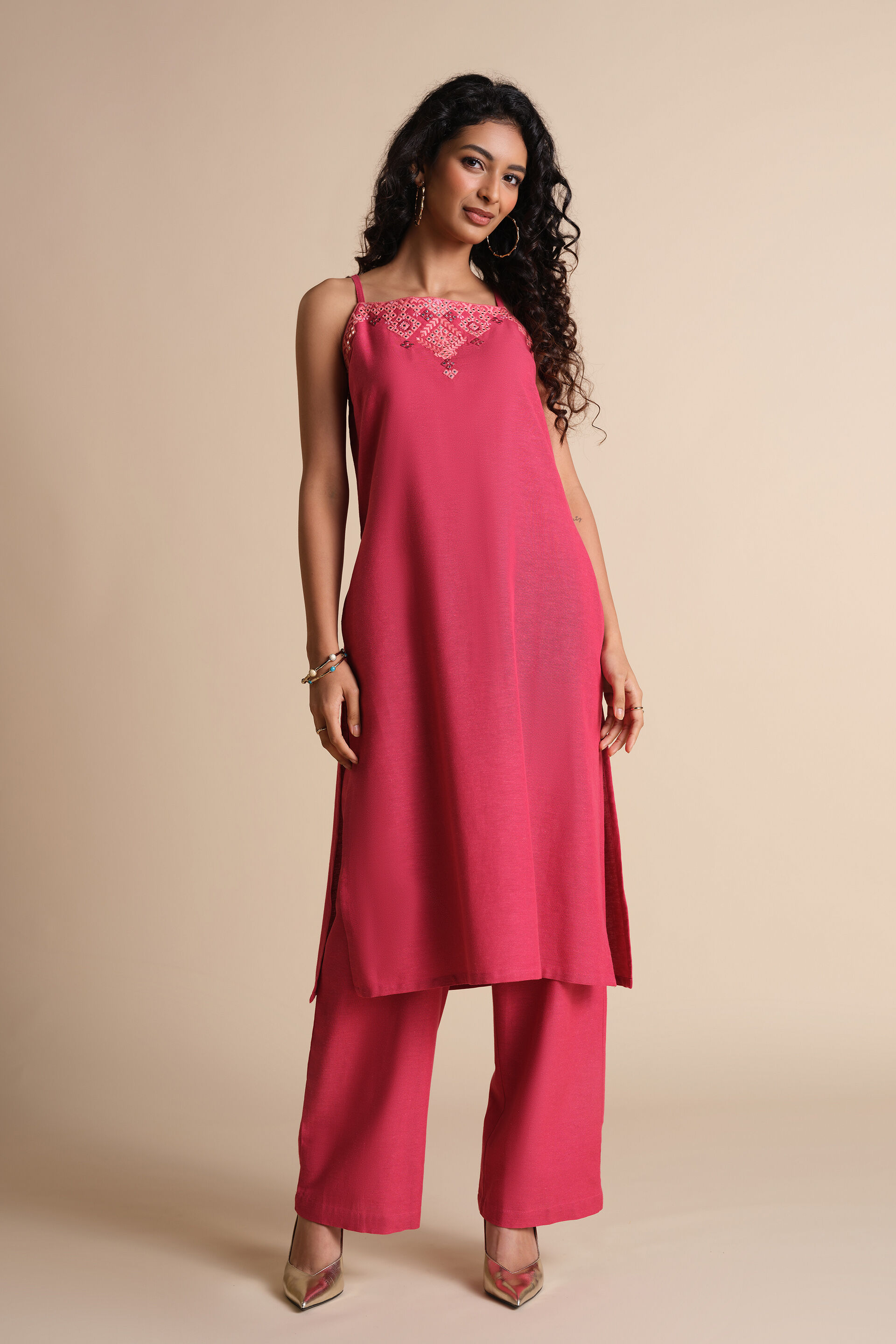 Become the occasion donning this ecleclic & vibrant kurta set. Made from a soft and flowy fabric, this 2-piece set comes with a spaghetti-strap kurta adorning geometric embroidery & mirror work. Paired with flowy straight pants, this set ensures you stay stylish and comfortable throughout any celebration.