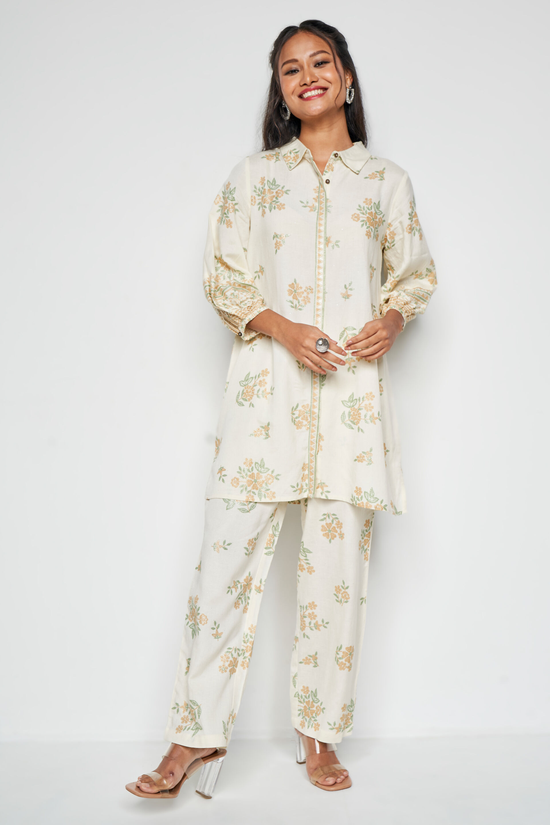 Our Head In The Clouds coord set has a top with buttons down the front and a soft collar. While we love a print-on-print look, the pants also pair well with other kurtas in your closet.