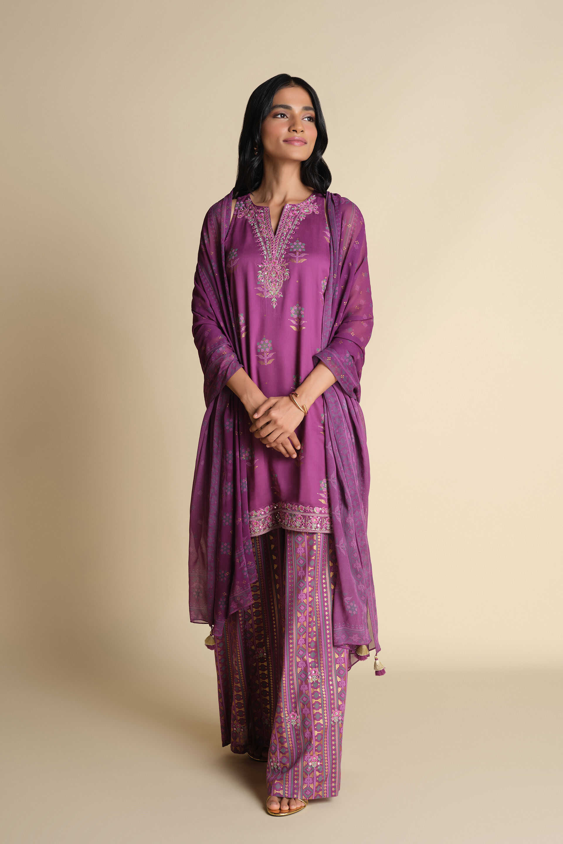 Much liked the loved ice gola flavour, this fun and exciting kurta set is designed for celebrations. This 3-piece set comprises of a short kurta, sharara bottom & dupatta, crafted from soft & flowy modal fabric. Featuring India-inspired prints with embroidery details, this set is perfect for weddings & special celebrations.