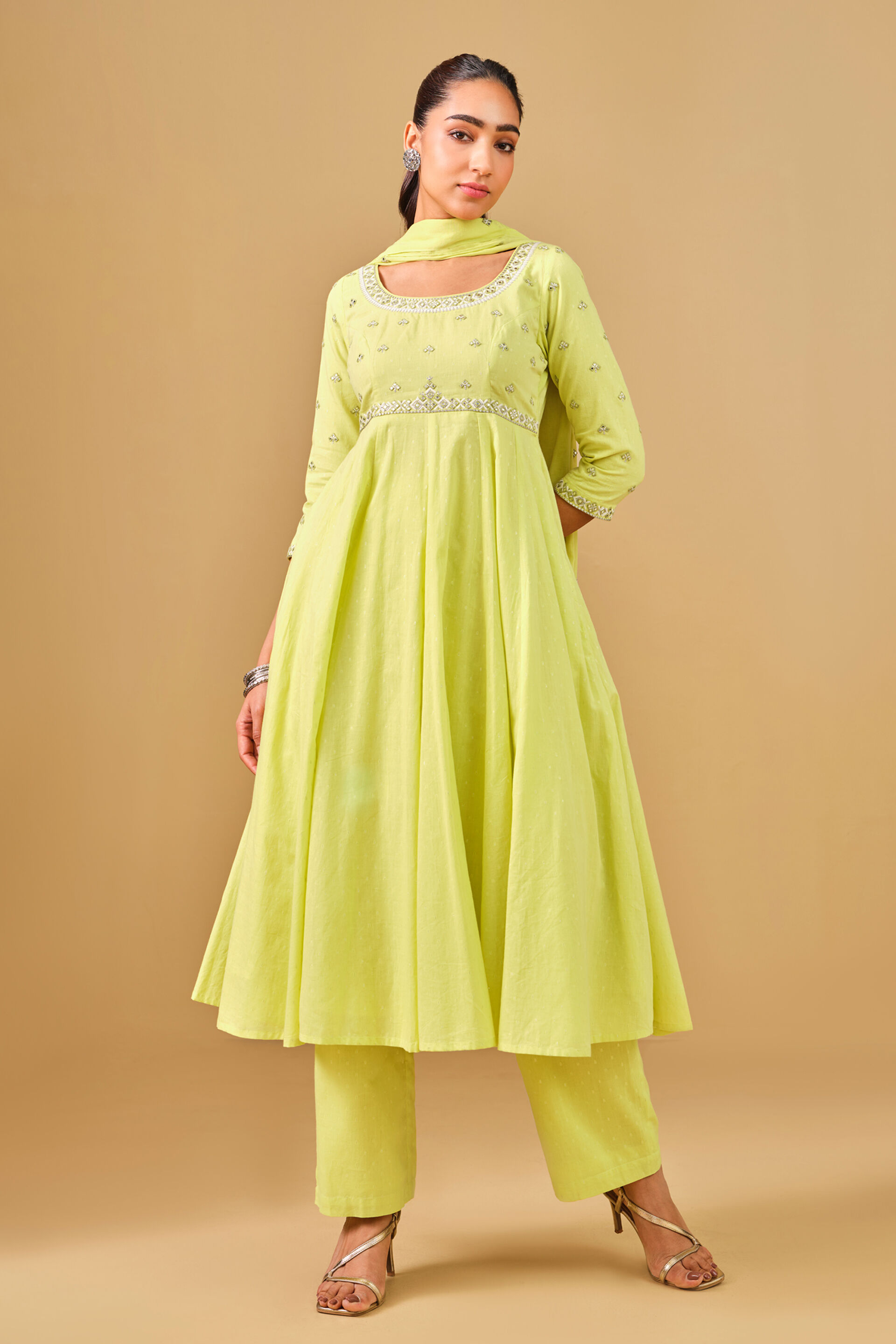 Designed with 100% cotton, this 3-piece Anarkali kurta set will always impress. Featuring mirror embroidery along the neck and torso on tonal shades of lime green, this kurta set is perfect for any summer occasion.