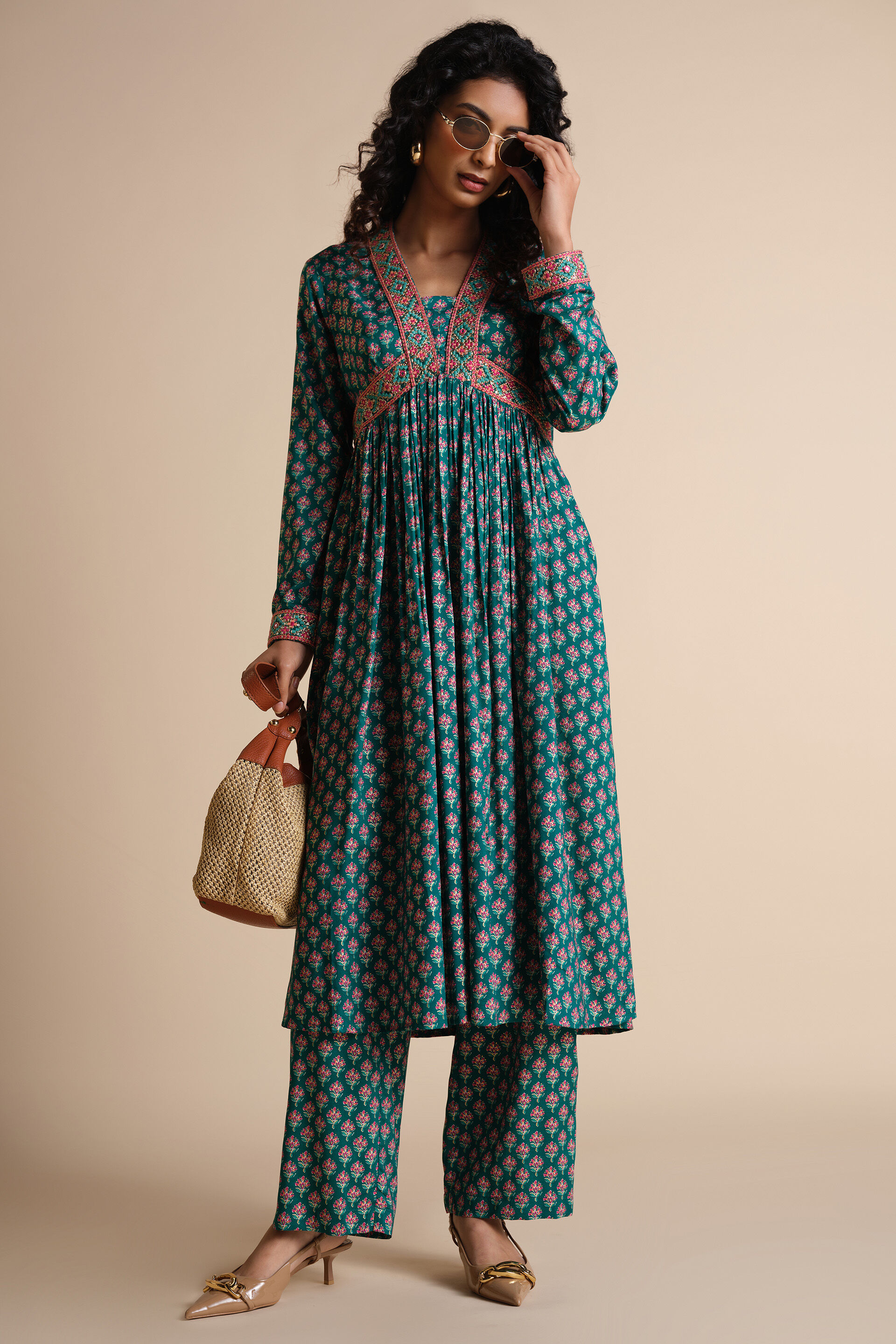 Get ready for any celebration with this floral print 2-piece set that comprises of a kurta & bottoms. Featuring all-over floral prints, this beautiful green ensemble comes with embroidered panels along the neckline & waist giving it definition. A perfect set for mehendi or sangeet.