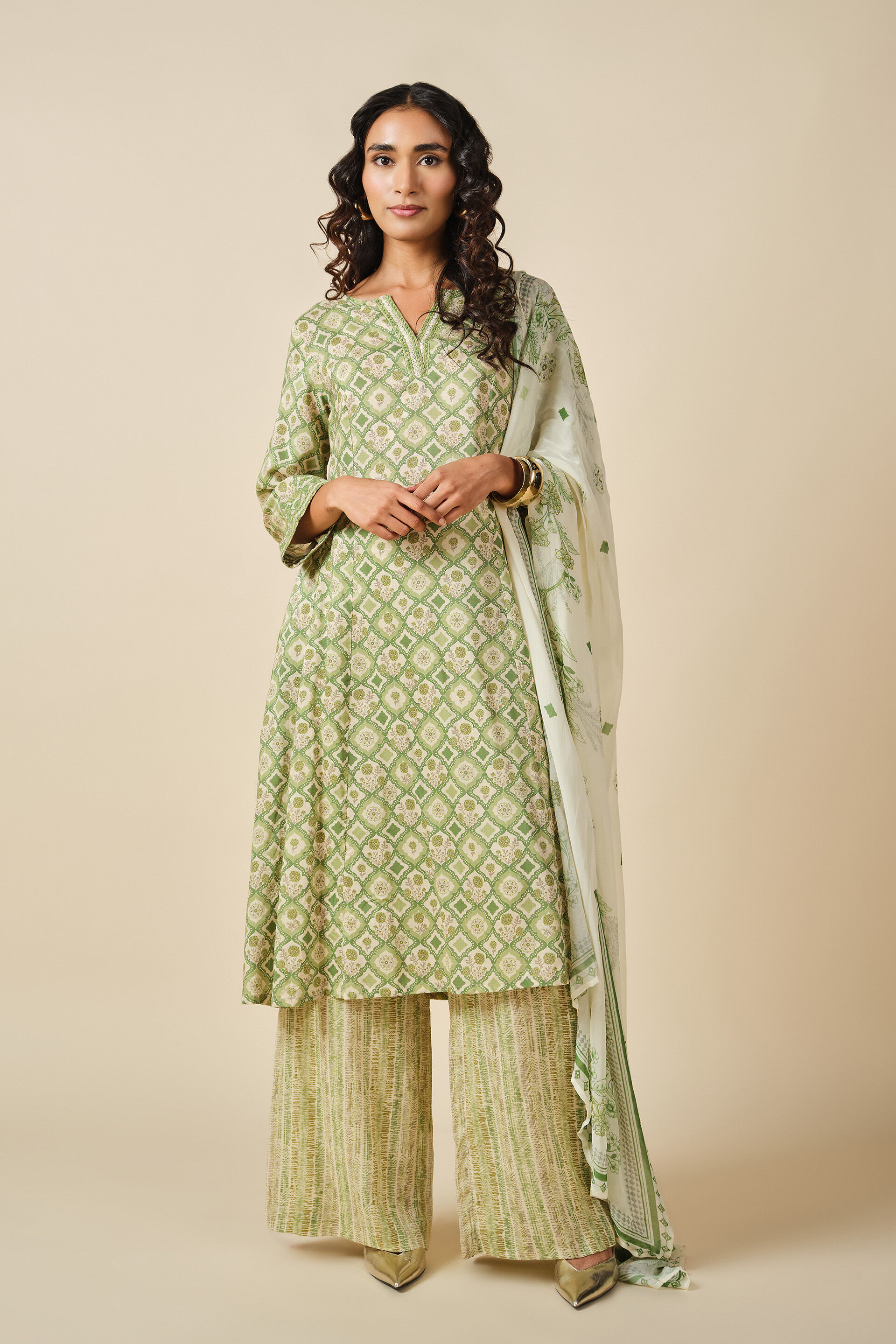 This kurta set feels like a breeze in soft & flowy modal. Featuring India-inspired prints, this set comes in a fit-and-flare silhouette with embroidery details around the neckline & sleeves. Paired with striped pants & a floral dupatta, this ensemble is just as fun to chill in summers.