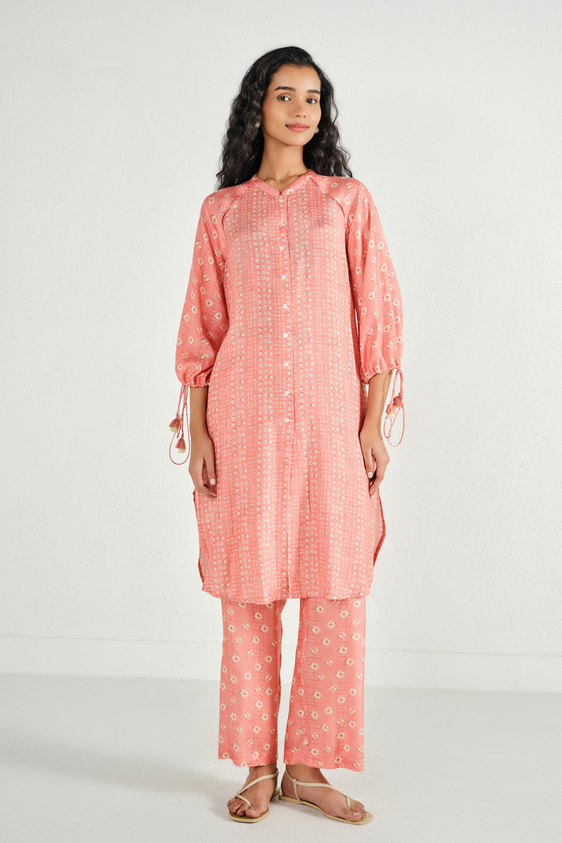A printed two piece set in a light coral tone that comes with a straight kurta featuring a band collar, front tie-up detail, and three-quarter sleeves, paired with straight pants.